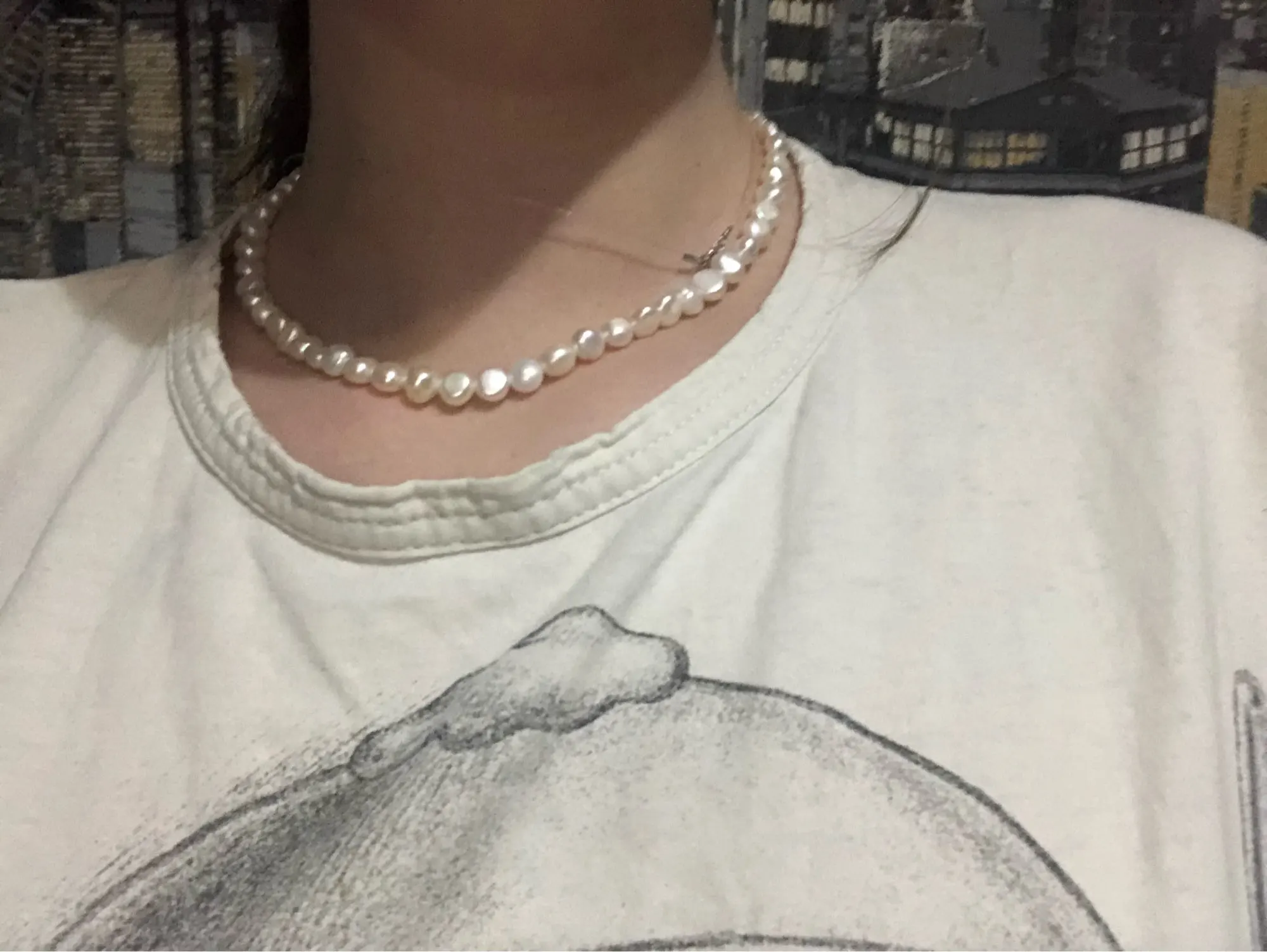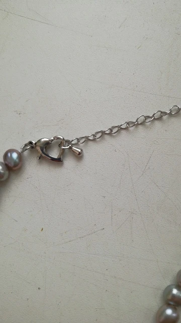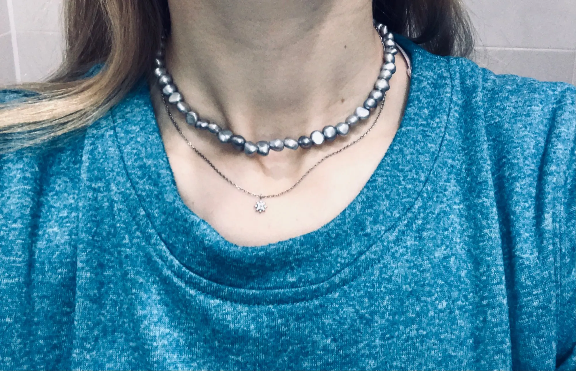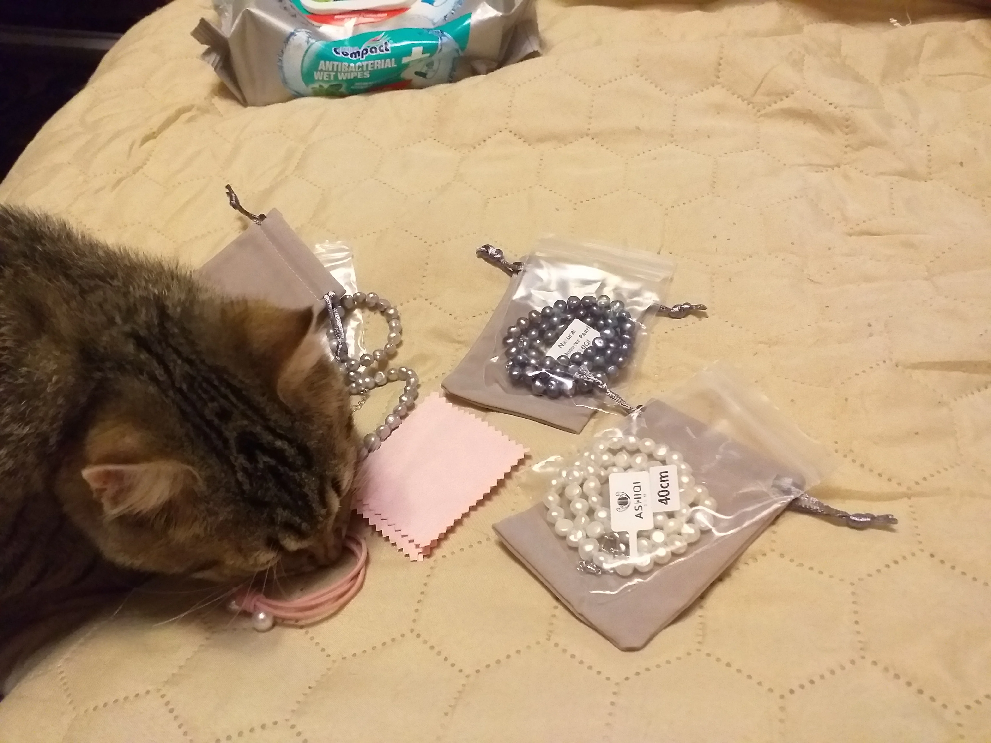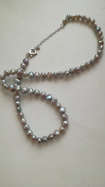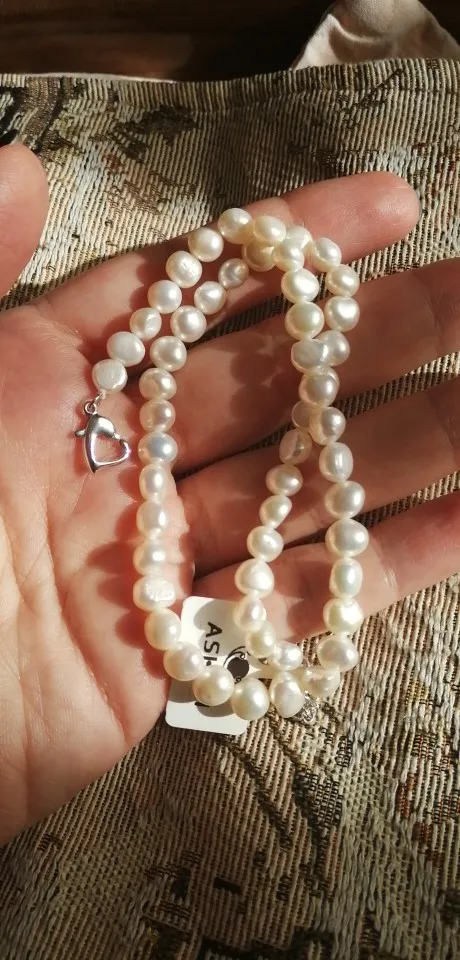 Чокер пришёл за месяц. Красивый мешочек с салфеточкой. Жемчуг на зубах скрипит, на ощупь холодный, не легкий, значит можно смело сказать, что он настоящий, хотя выращен в пресной воде, как указано на этикетке, а значит все же в искусственной среде и является не натуральным. Длина ожерелья размера 36см - 36 см вместе с застежкой в форме сердечка, регулировать длину можно с помощью добавочных звеньев, длина которых составляет 4,5 см. Так что 36 смело превращается в 40см. Застежка на вид крепкая, немного неудобно застегивать сначала, но потом получается быстро. Цвет не чисто серый как на фото, при холодном освещении переливается перламутрово-розоватым оттенком. Жемчужинки разной формы, диаметром ~5-6мм, одеты на нитку, по-моему синтетическую. В моём чокере есть небольшой косяк, в одной из жемчужин отверстие для нитки сделано не по центру, а как-то сбоку, и из-за того, что расстояние между жемчужинами практически отсутствует, ожерелье в этом месте топорщится. Можно конечно переделать, но я
