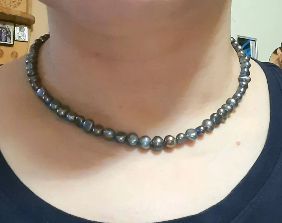Сегодня получила ожерелье из черного жемчуга. Сам жемчуг мелковат, цвет серо-синий,но на шее смотрится хорошо,мне понравился.Продавцу спас ибо ,магазин рекомендую.