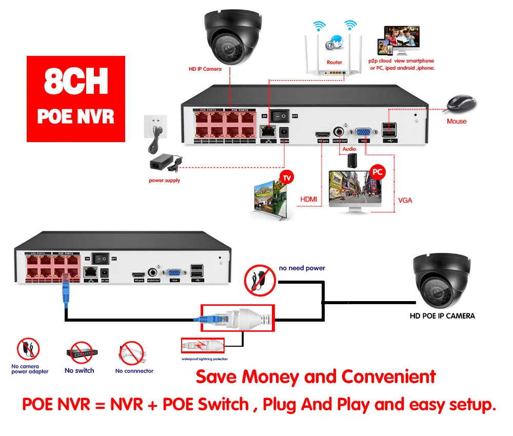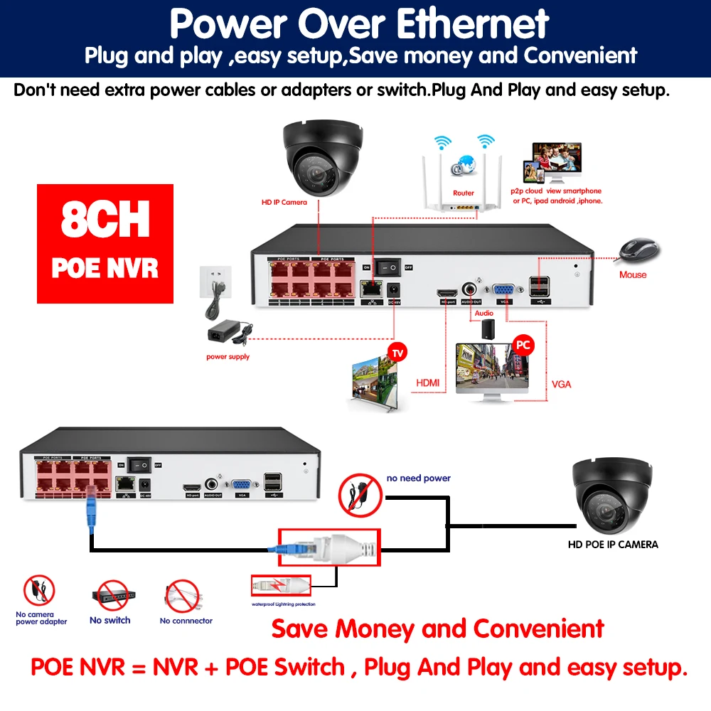 Нет дополнительных кабелей питания или адаптеров, просто подключив ip-камеру к NVR с помощью одного кабеля, вы можете легко завершить установку без знания о компьютере или сети и начать наслаждаться супер простым мониторингом среди вашего смартфона, планшета или ПК.