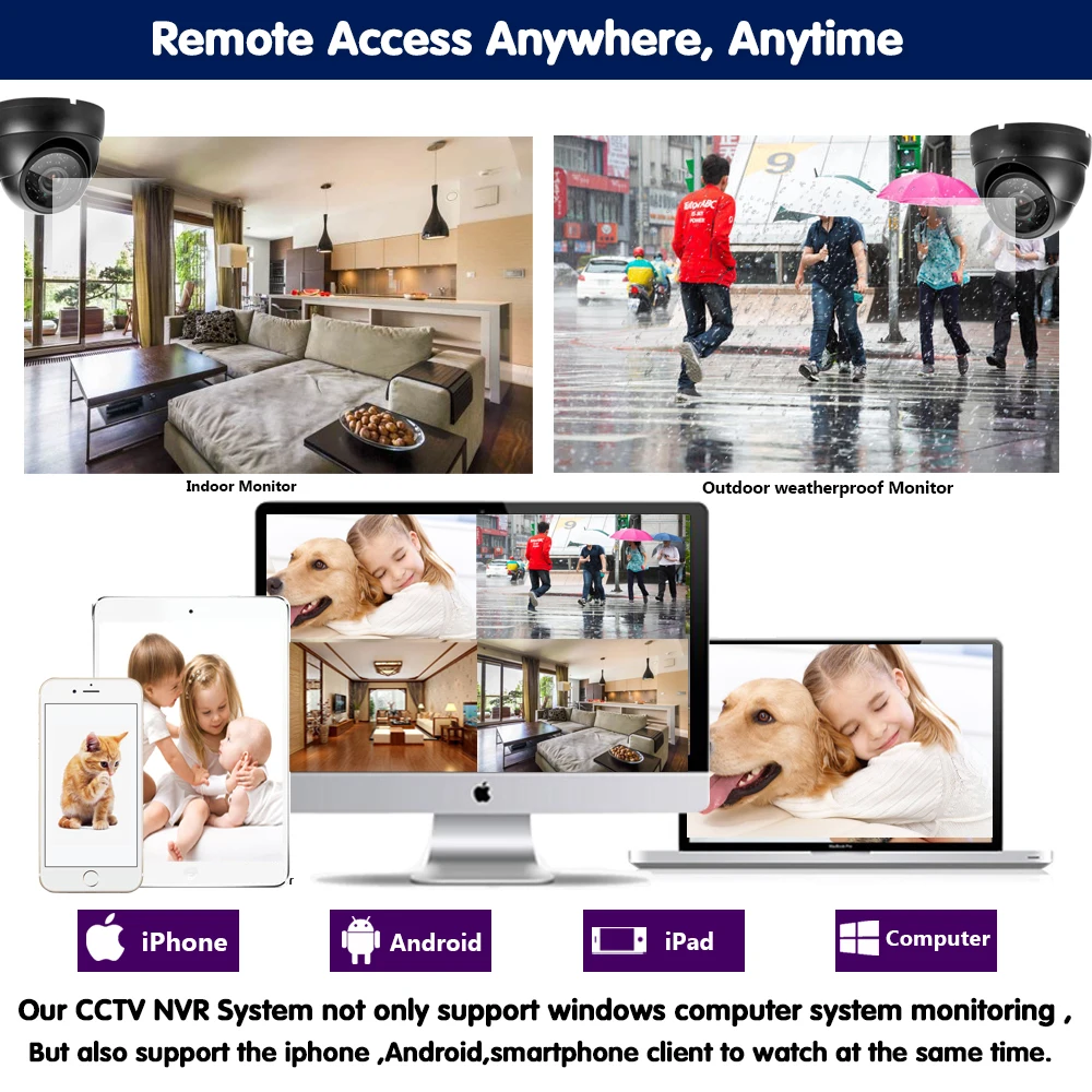Простая настройка, всего 4 шага для просмотра на мобильный телефон,Просмотр видео в режиме реального времени в системе из любого места и в любое время с помощью смартфона, стола или ПК с передовой технологией P2P, вы можете получить удаленный доступ к вашей системе в течение нескольких минут или меньше, нет необходимости в переадресации, удаленный доступ никогда не был таким простым!