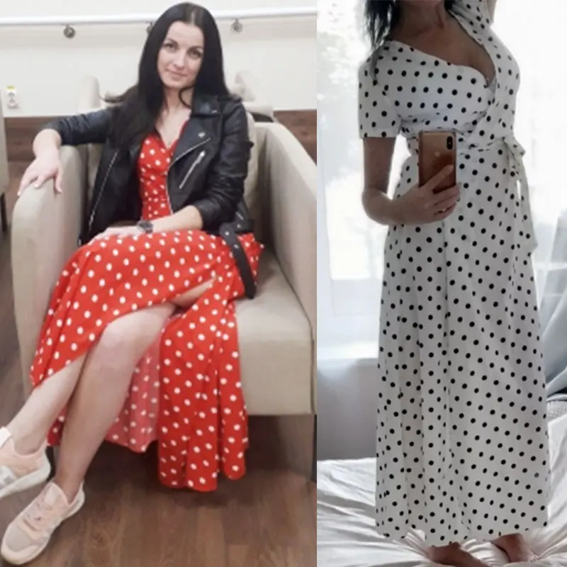 Продавец отправил платье очень быстро и пришло оно за 1,5 недели, учитывая, что были новогодние каникулы, это просто мега-скорость. Ткань - шифон, легкая, мягкая. Цвет яркий, реально красный в белый горох. Качество хорошее, всего пару торчащих ниток, швы в меру аккуратные. Вырез на груди большой, нужно будет закрепить булавкой или брошкой. А разрез по ноге прямо от бедра. Сплошной сексапил. На лето - огонь. Сбоку молния, ремешок идет отдельно. Сидит по фигуре. Мои параметры 96-74-90, рост 164, размер М. Все подошло.
