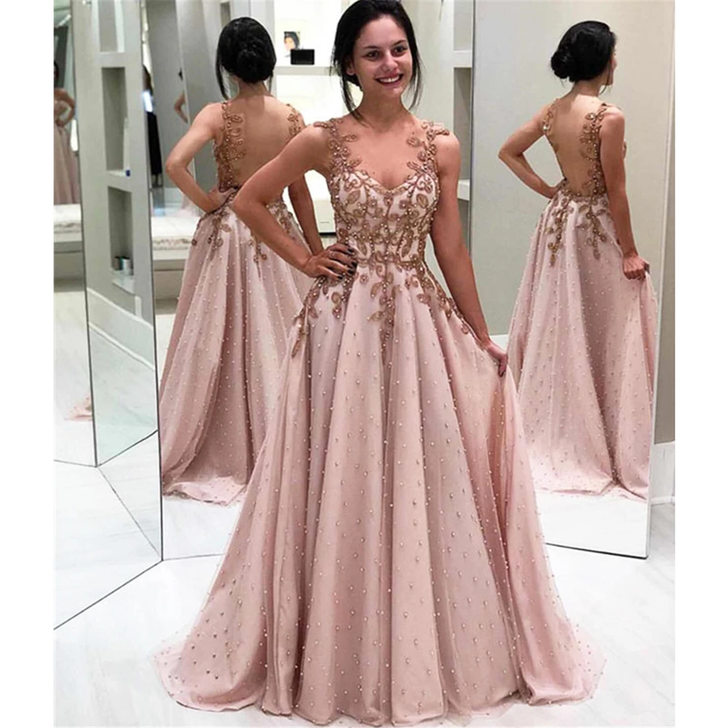 Сексуальное вечернее платье с открытой спиной, Длинное Элегантное Тюлевое платье с бусинами и жемчужинами, вечерние платья с аппликациями, ТРАПЕЦИЕВИДНОЕ официальное платье для вечеринки