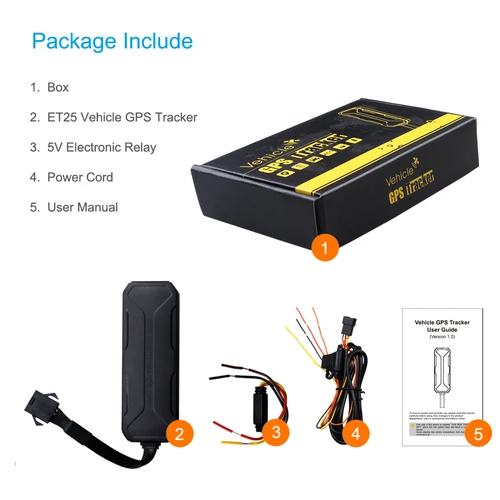 1 * Автомобильный GPS трекер ET25 1*5 в электронное реле 1 * шнур питания 1 * Руководство пользователя 1 * оригинальная коробка Примечание: sim-карта не поставляется с посылка, все клиенты должны купить sim-карту в своем местном месте, спасибо!