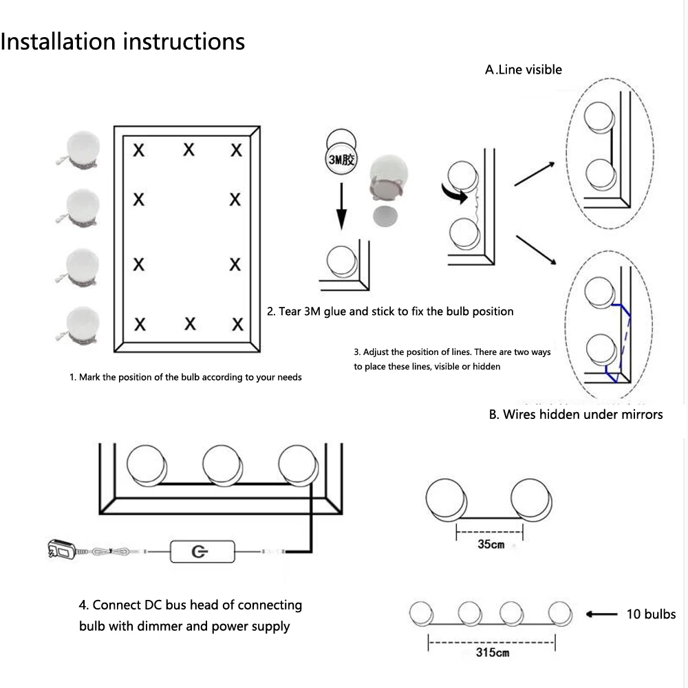 Особенности:1. Выходное напряжение постоянного тока 12 В, безопасно для использования. G5 Современная сферическая лампочка, DC 12V Выходное напряжение2. Два вида метода установки лампы. Оснащён набором 3M наклейки на багажник автомобиля, сильная сила сцепления и нелегко упасть, вы можете наклеить светильник на гладкой поверхности Прямая поставка от производителя или используйте винты (не прилагаются) чтобы зафиксировать светильник. Встроенный разъем для провода в нижней части каждой лампы, чтобы вы могли поместить резервный провод внутрь, Макс. Расстояние между каждой лампой составляет 25,5 см, регулировка лампы Длина провода в соответствии с вашими потребностями.3. Новый сенсорный переключатель управления и плавный диммер. Не Ослепительная, плавная регулировка яркости, регулировка яркости от 20% до 100% с помощью длинного сенсорного диммера, функция затемнения памяти. Сделай Сам свое зеркало, используемое для заполнения светильник, измените внешний вид и выглядите более красиво.4. Двойное использование внутри и снаружи. Водонепроницаемая лампа IP66, широко используемая для декора шкафа, стеклянная декоративная лампа, зеркальная декоративная лампа, студийная декоративная лампа, лампа для декора сцены. Подходит для свадьбы, дня рождения, Дня Святого Валентина и других праздников.Основные преимущества продукта:Винт на зеркале3 м СтикерыСкрыть проводаОснование из алюминиевого сплаваТермозащитаВстроенная установкаСъемный винтСпецификация:Тип: светодиодная Косметическая зеркальная лампа/косметический зеркальный светильникМатериал: алюминиевый сплав + PVДля установки лампы: винт и 3M СтикерыЦвет изделия: белыйСветодиодный Тип: 2835Светодиодный Количество: 6/10 штМощность: 6 Вт/10 ВтСветильник Цвет: белый/теплый белый/Природа БелыйЦветовая температура: 3200K / 6500KДиммируемая: Плавная диммируемаяВходное напряжение: 110 В-240 В переменного токаВыходное напряжение: 12 В постоянного токаСрок службы: До 50000 чДиаметр лампы: 5 см/2 дюймаРасстояние между 2 лампочками: 25,5 см/10"Посылка:Светодиодное косметическое зеркало светильник + диммер провода + адаптер + 3 М Стикеры