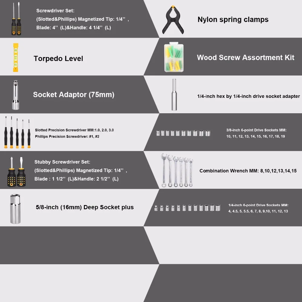 Набор инструментов DEKO 168 шт. имеет кованый корпус из хром-ванадия для крутящего момента, прочности и долговечности. Набор также обеспечивает полную полировку хромированной отделки для защиты от коррозии, так что инструменты прослужат долго и хорошо изнашиваются. Все инструменты в этом наборе соответствуют или превышают все спецификации ANSI для дополнительной безопасности. Все детали этого набора надежно помещаются в Прочный чехол для переноски с выдувным покрытием для удобной организации и удобной портативности.