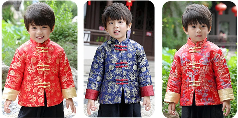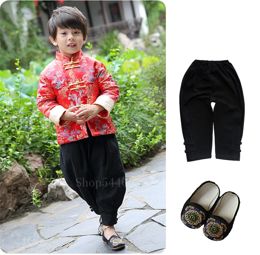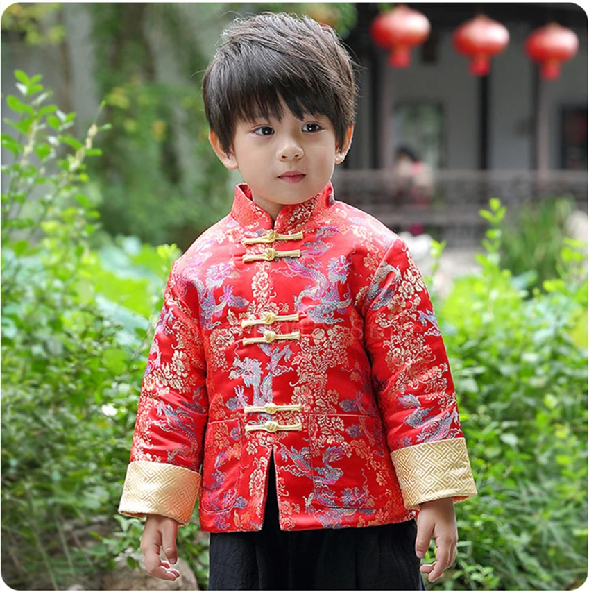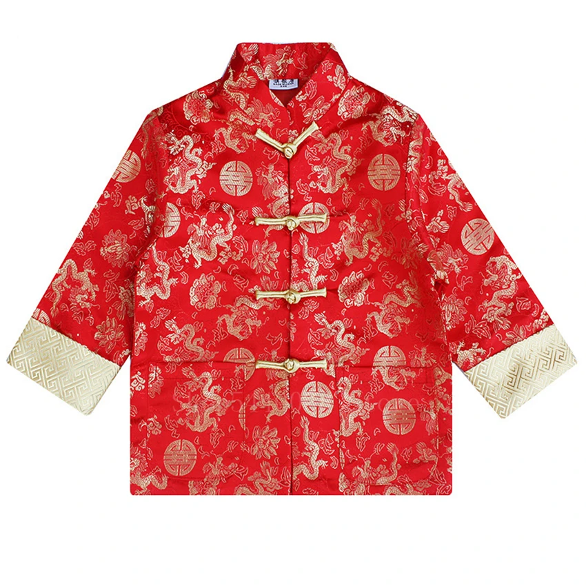 Новогодняя Китайская традиционная одежда для детей, праздничный ретро костюм для маленьких мальчиков с золотым Драконом, атласный костюм Тан, комплект из топа и брюк