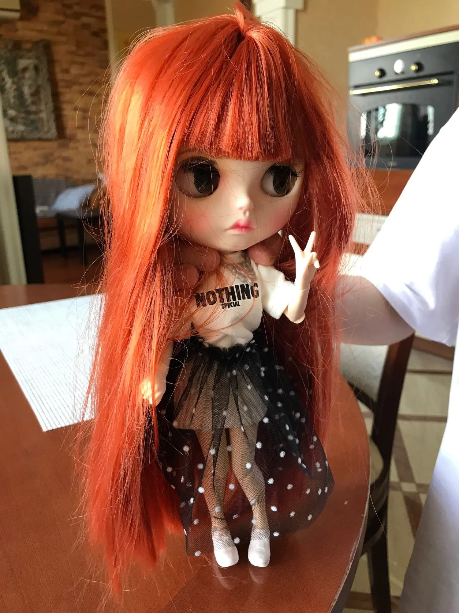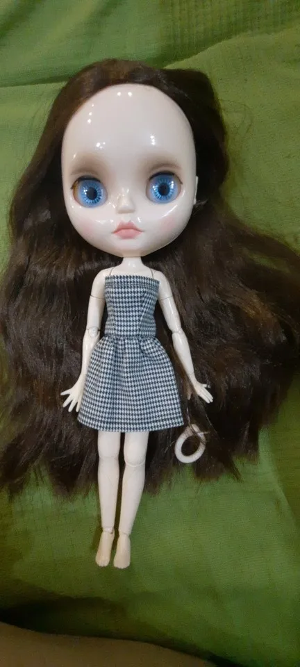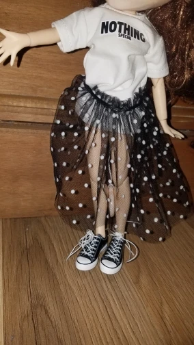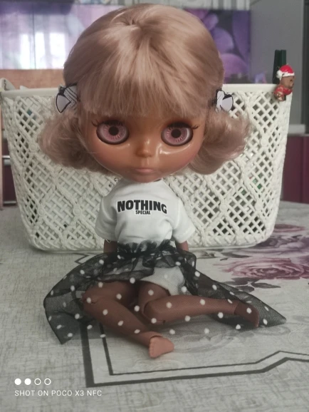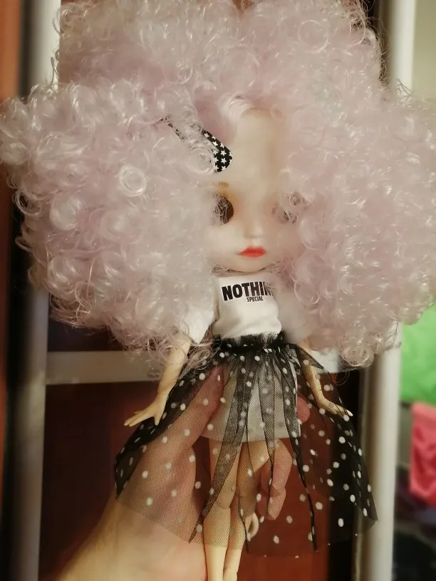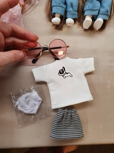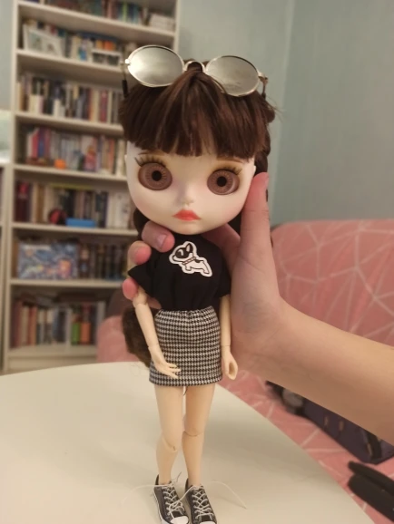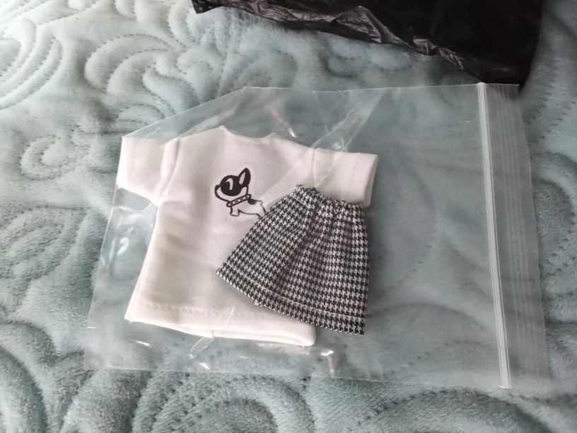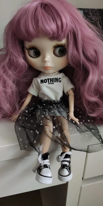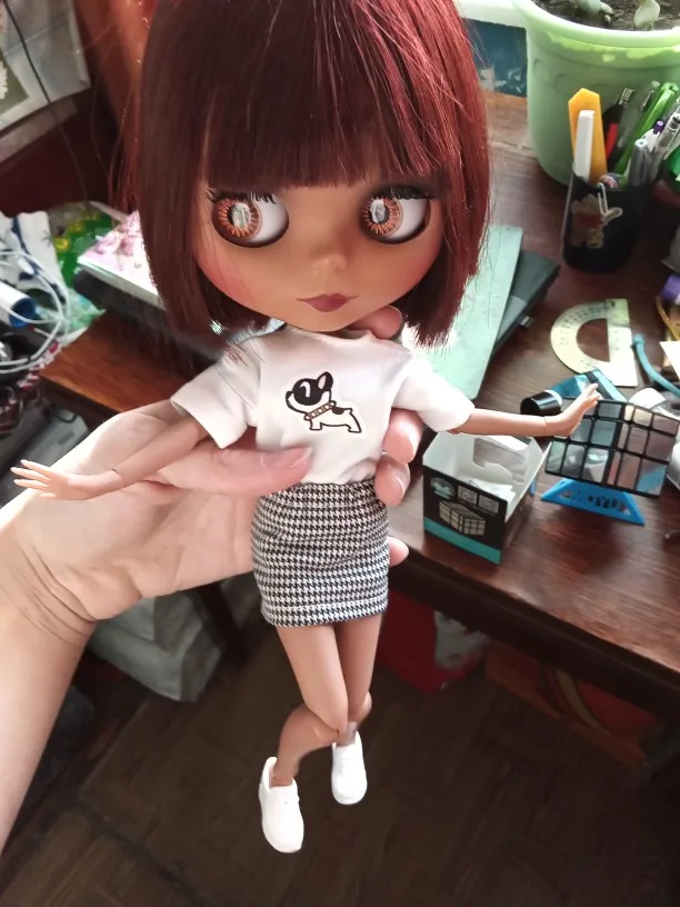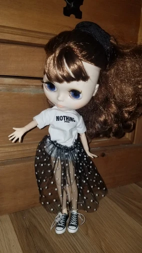 Соответствует. Очень классный комплект. Хотя он для блайз, мерила на трех своих разных кукол. На шарнирной блайз смотрится шикарно. Те, у кого есть Синьи, могли заметить, что им часто подходит одежда блайз - да, этот костюм на Синьи тоже отлично смотрится. На дешёвом шарнирном теле без названия футболка села как родная, а вот юбка уже слишком мини. Юбка на резинке, тугая. Футболка на липучке, не до конца, одевать через ноги