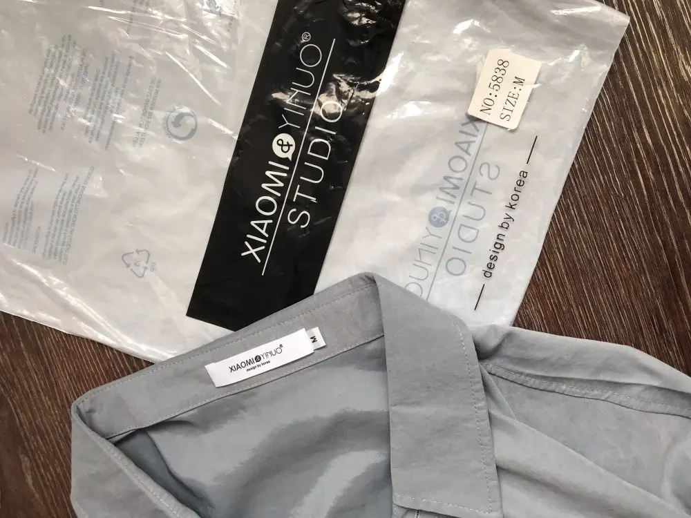Упаковано. Отлично. Доставка вовремя. Рубашка сшита качественно. Тонкая. На ощупь ткань как замш или велюр. Цвет, кстати не сказала бы, что голубой. Скорее нежно серый. Всё равно нравится. Размер эль. На 50 - 52 российский лёгкий оверсайз. Продавец положил подарок. Резинка.