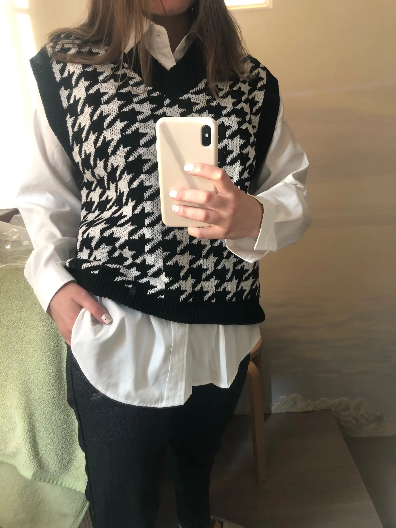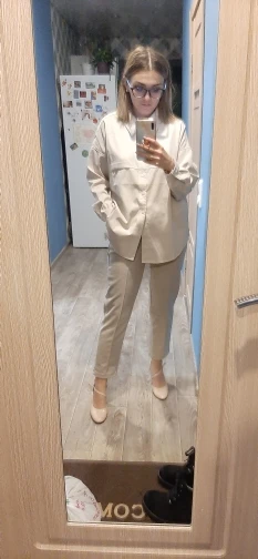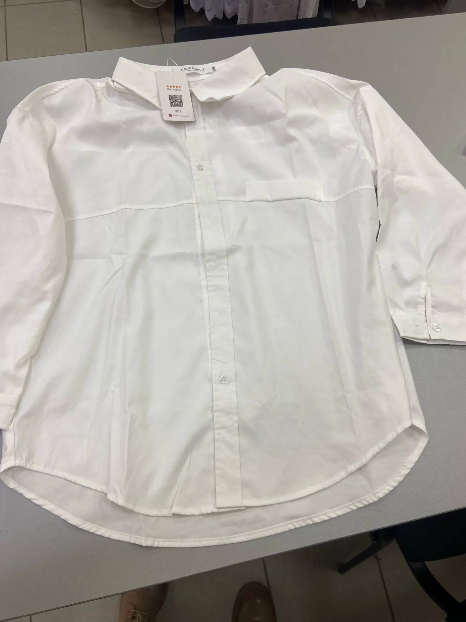 Получила свою рубашку, заказ пришёл на кассу пятёрочки. Сама рубашка приятная к телу, чувствуется хлопок в составе. С жилеткой смотрится супер, да и как отдельный элемент. Заказывала себе размер М, рукава немного коротковаты. Швы все ровные, нитки нигде не торчат. Товаром довольна