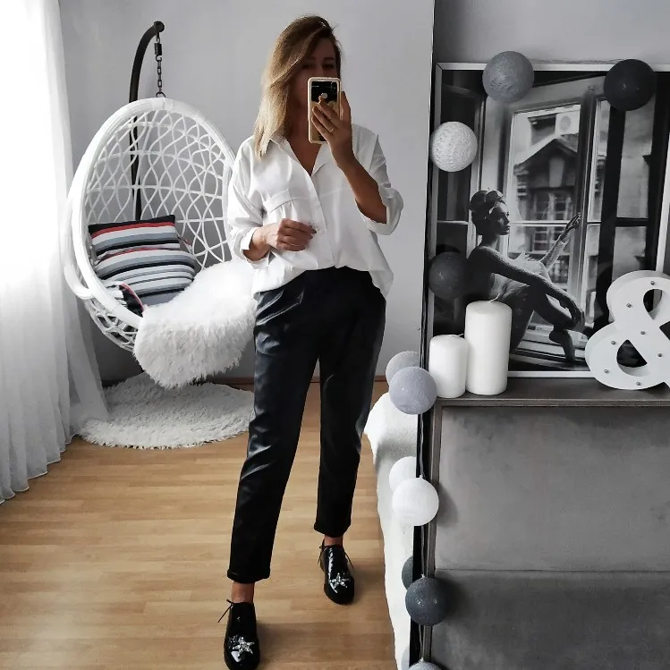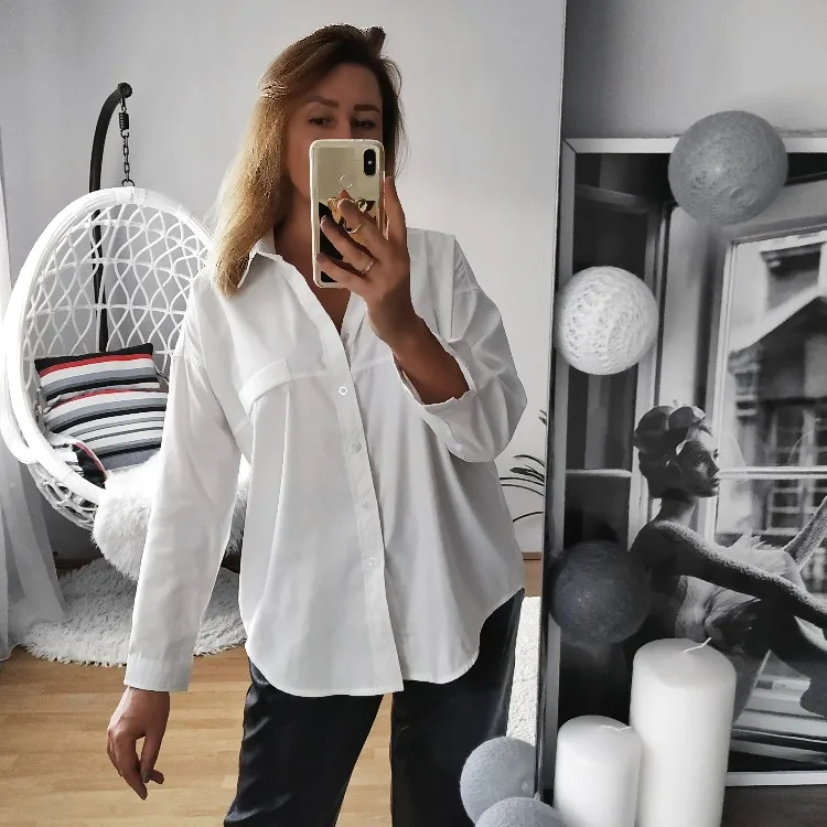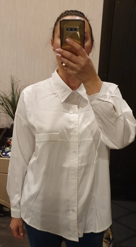 Доставка до Москвы 3 недели. Пришла в почтовике и прозрачном зипе, трек полностью отслеживался. Эта модель в магазине представлена в 3 расцветках. Я выбрала белую. На свои параметры 98/76/96 и рост 172 см взяла L. Рубашка села свободно, как на фото продавца. Ткань очень приятная, мягкая , воздушная, в составе полиэстер и хлопок . Материал очень нежный и приятен к коже. Рукава на мой рост полноценные.