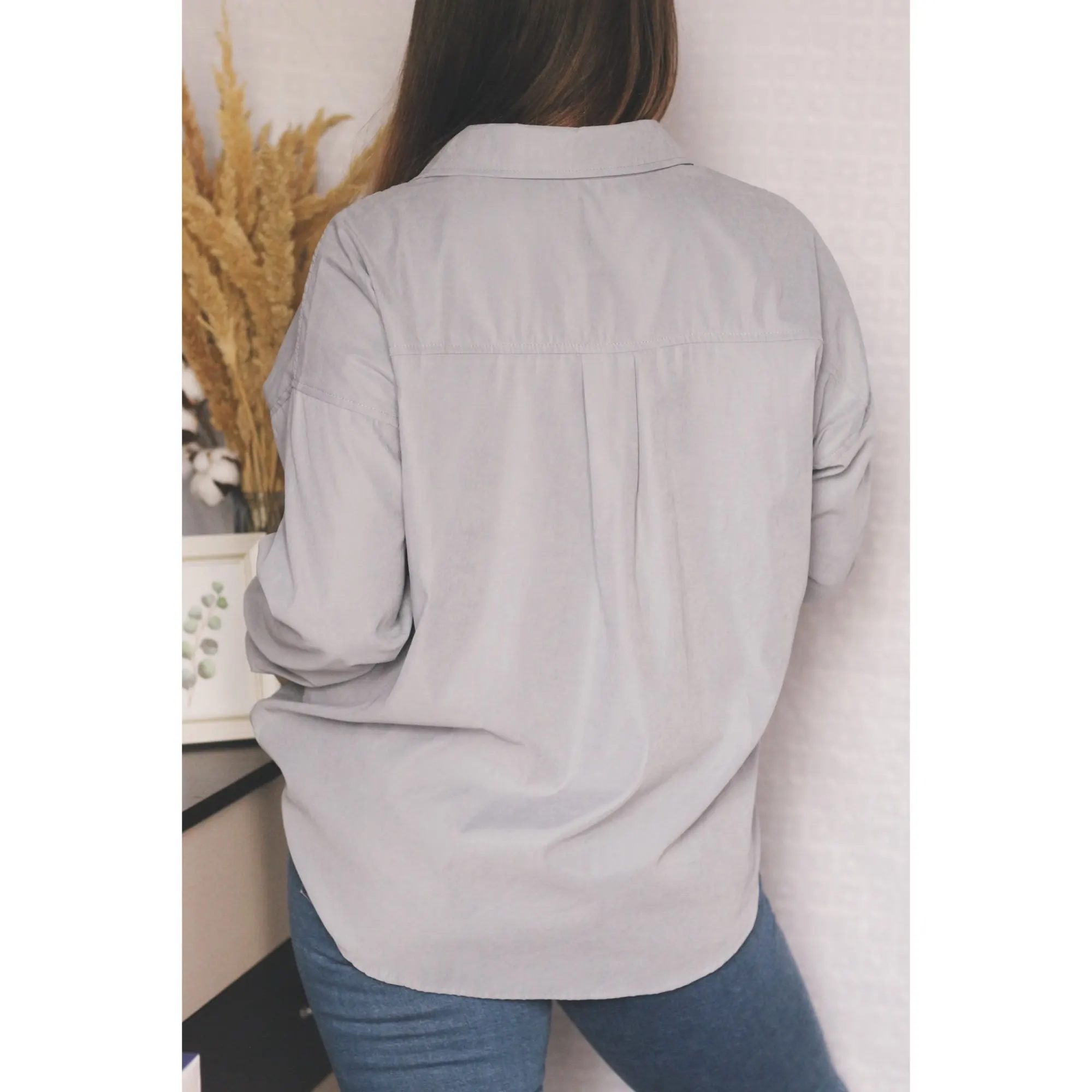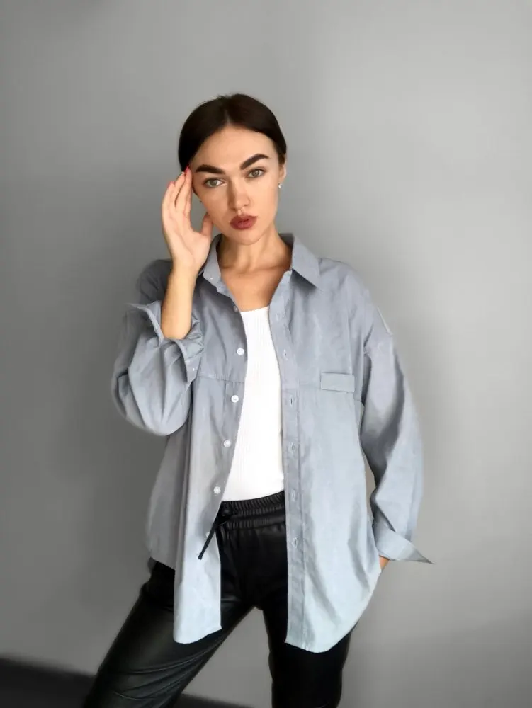 Рубашка классная. Материал плотный, не просвечивается. Соответствует описанию и фото. Цвет серо-голубой, оттенок металлический немного, красивый. На параметры ОГ-82, ОТ-66,ОБ-86 и рост 166 заказала L, чтобы был как оверсайз, длина ниже попы получилась. Размер M на эти параметры тоже бы подошёл.