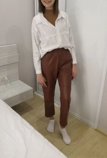 У рубашки очень необычная ткань – будто велюровая или под замшу. Это полиэстер, приятный к телу. Крой прямой. Представлена в белом, бежевом и голубом цветах - На мне размер Л (параметры 98-68) – очень комфортно на мои параметры, достаточно свободно - На рост 178см в целом хорошо, но лучше сядет на девочек по ниже из-за горизонтального шва на груди (на мне он чуть завышен)