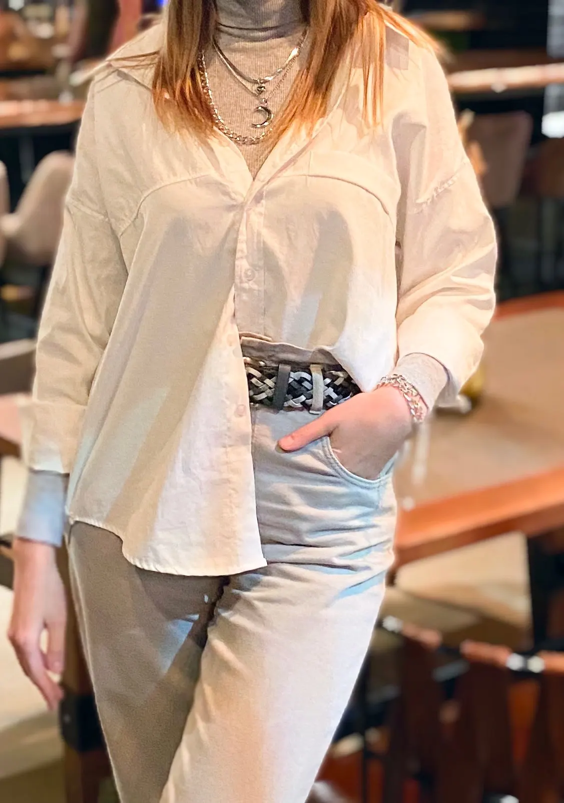 Очень классная базовая рубашка оверсайз, безумно приятная ткань снаружи, изнутри не хлопок, а что-то похожее на балонь, качество очень хорошее, все швы ровные
