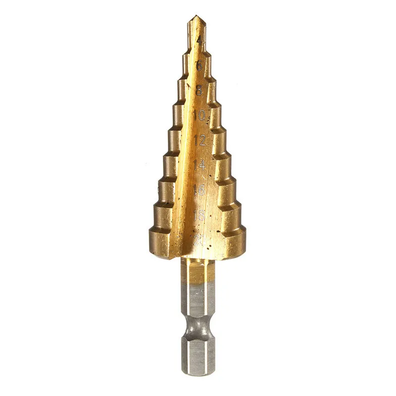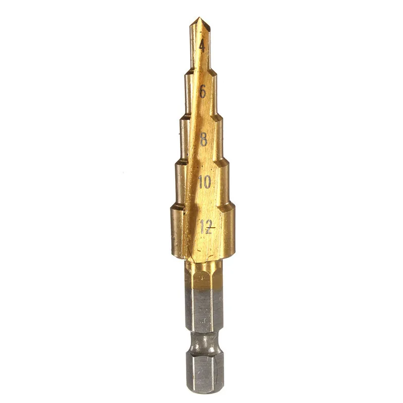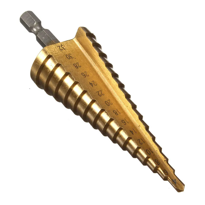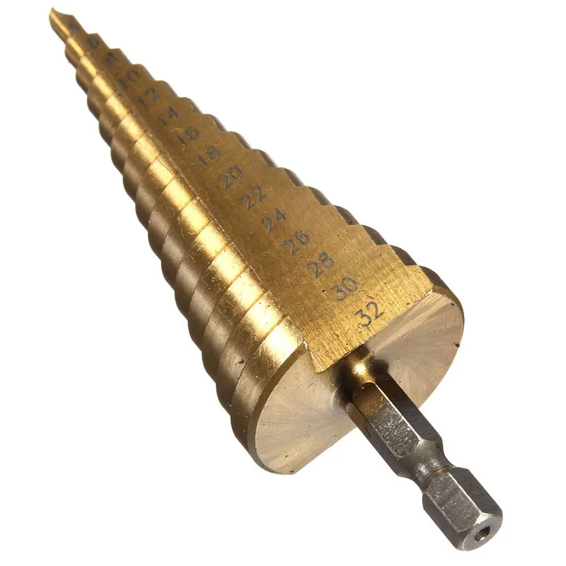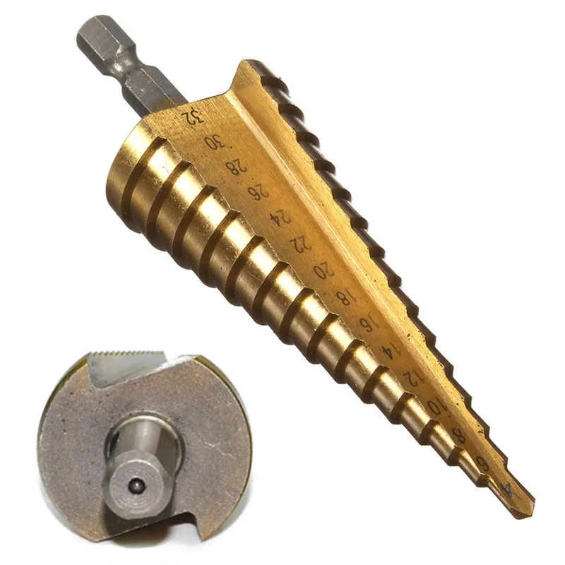 Это новая HSS стальная большая ступенчатая конусная дрель, титановая долота, набор резцов для отверстий, которая изготовлена из высококачественной стали HSS и с титановым покрытием, чтобы уменьшить трение и тепло. Подходит для резки отверстий из различных материалов, включая сталь, латунь, дерево, пластик и т. д.