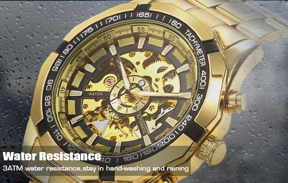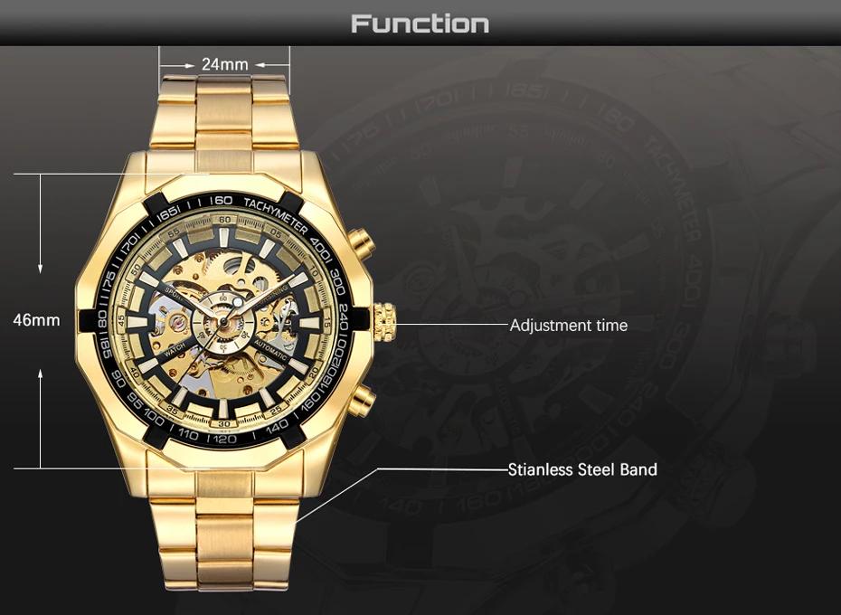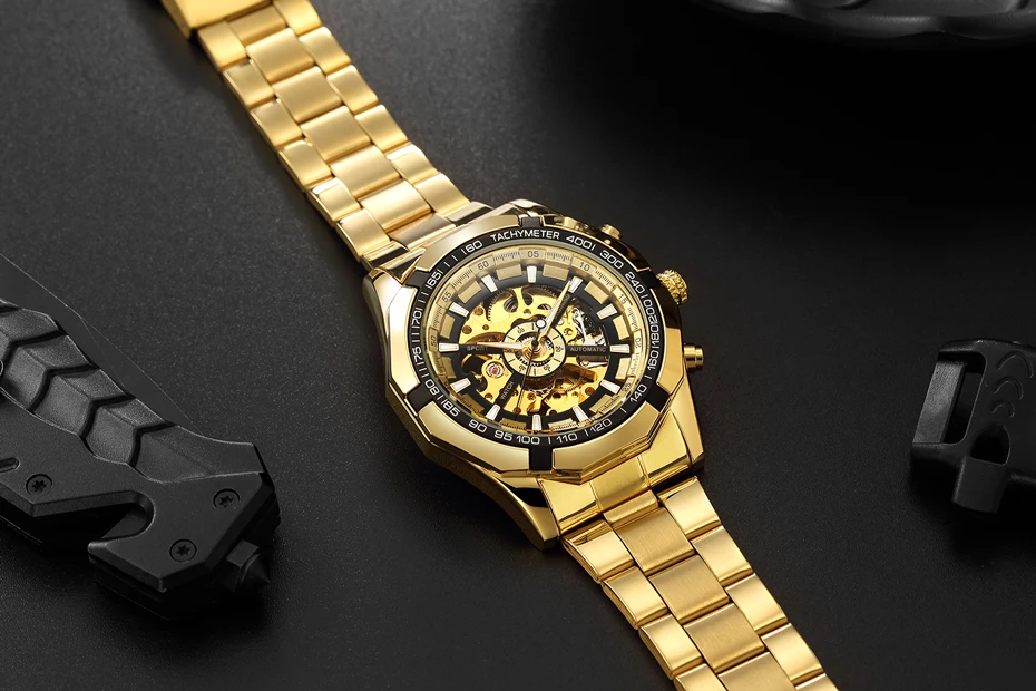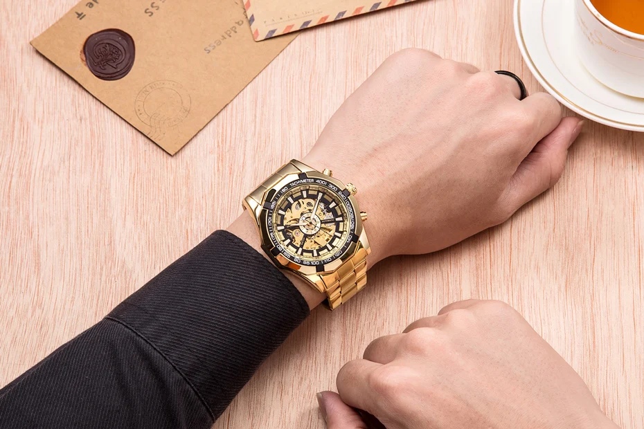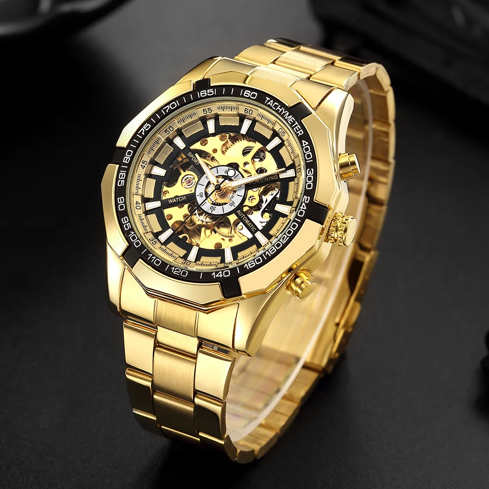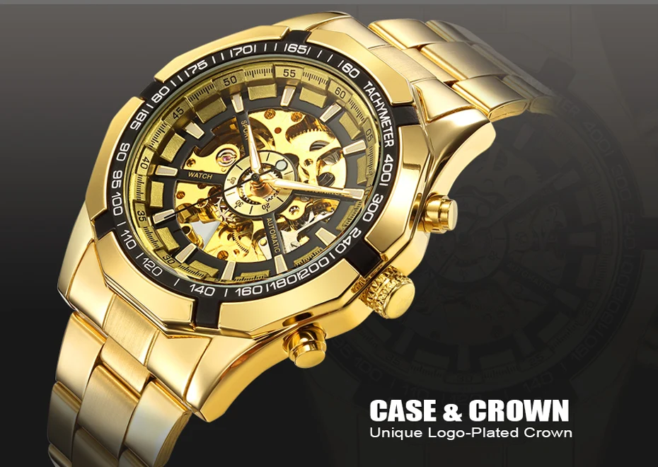 Часы Winner мужские, автоматические, механические, золотые, винтажные