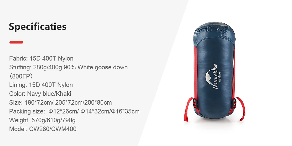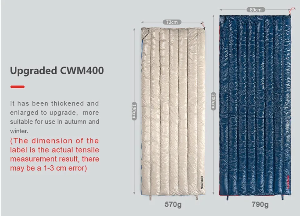 Сравнение размеров CWM400 = XL = 790 г (200*80 см) = 400 г 90% белый гусиный пух CW280 = M = 570 г (190*72 см) = 280 г 90% белый гусиный пух