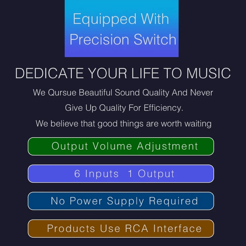 В 6-ти канальный аудио выбор сигнала коммутатор решает сложные линия штепсельной вилки и штепсельной вилки, которая равномерно подключает устройство ввода источника сигнала к коммутатору для удобного выбора.