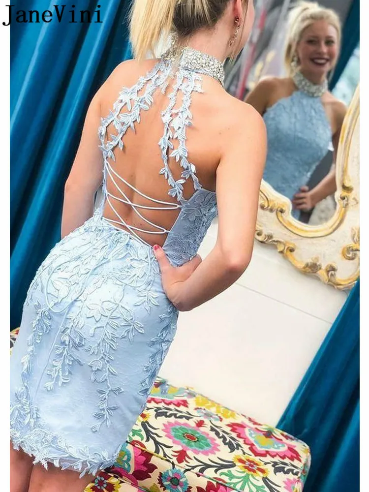 Женское короткое коктейльное платье JaneVini, расшитое бисером, с открытой спиной, длиной до колена, с высоким воротником