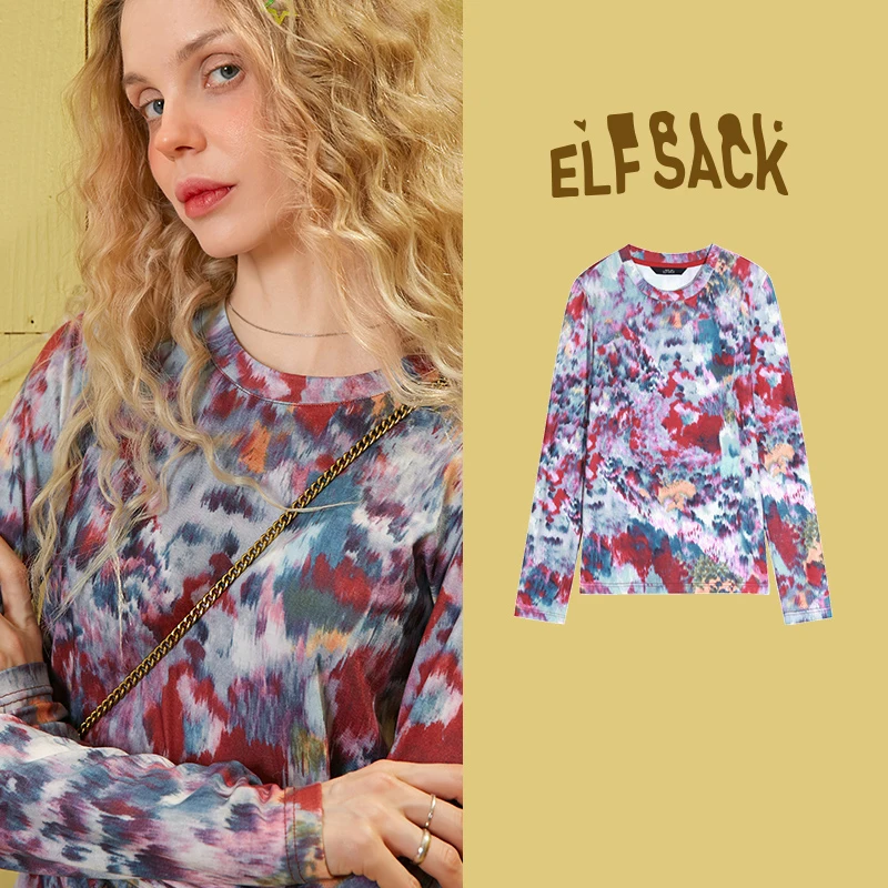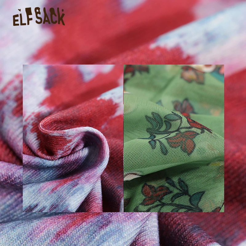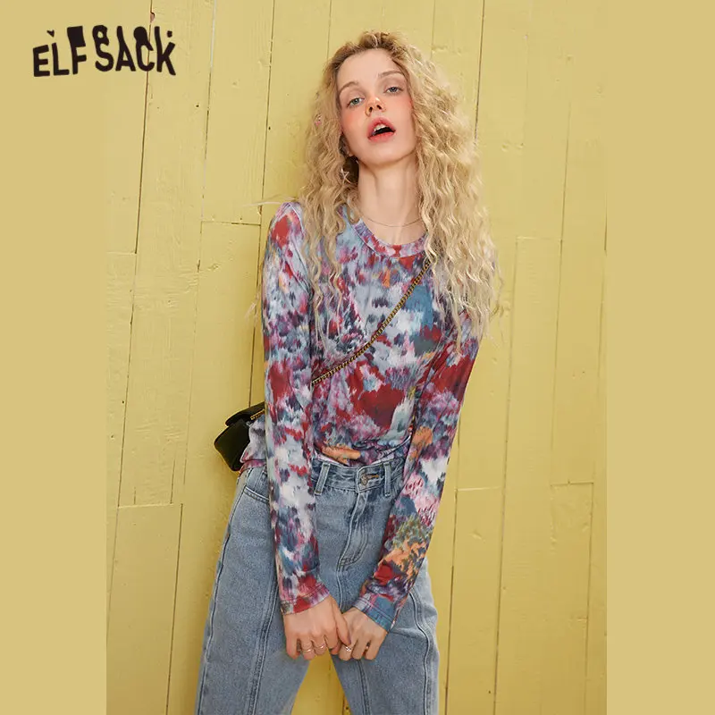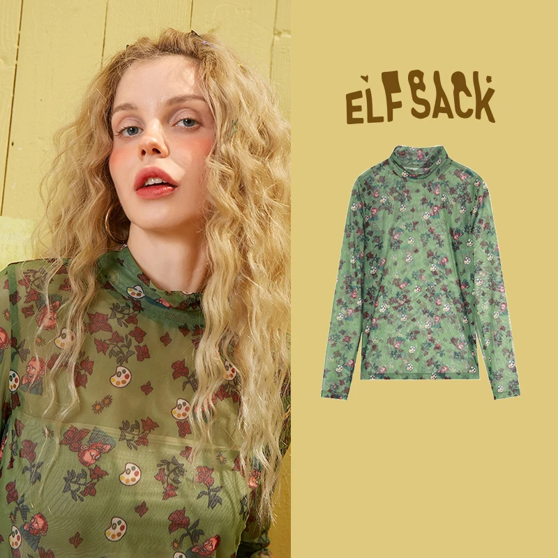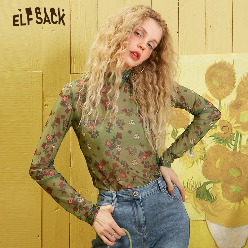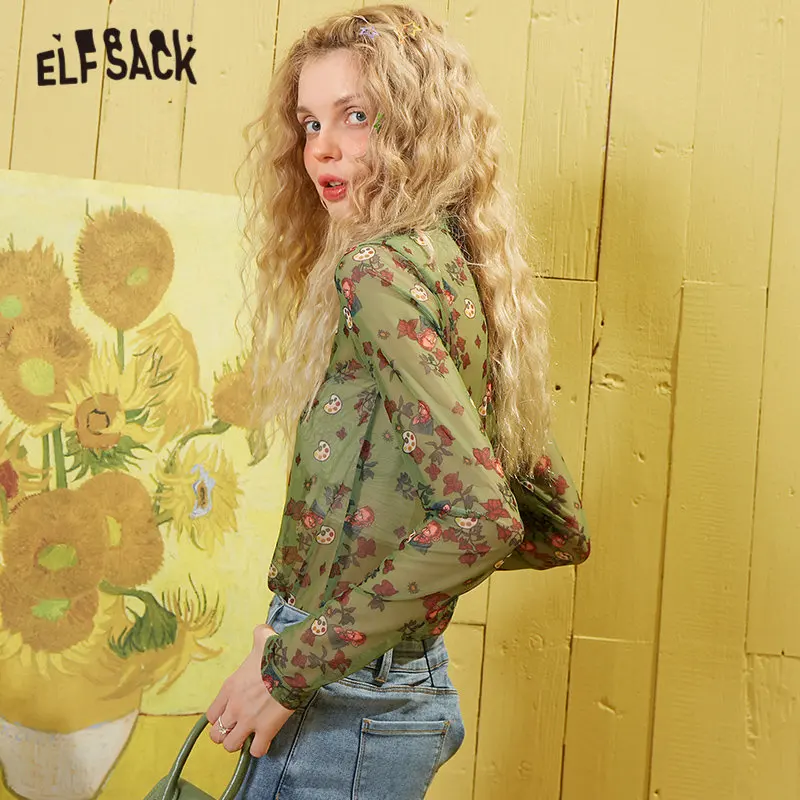 Женская шифоновая блуза ELFSACK, зеленая тонкая рыболовная сетка с цветочным принтом, сетчатая Сексуальная Блузка с длинным рукавом в Корейском стиле, весна 2020