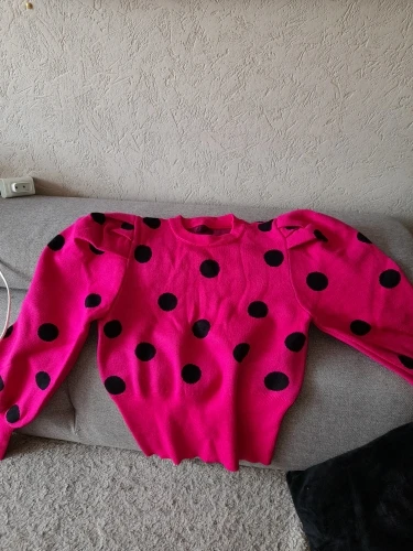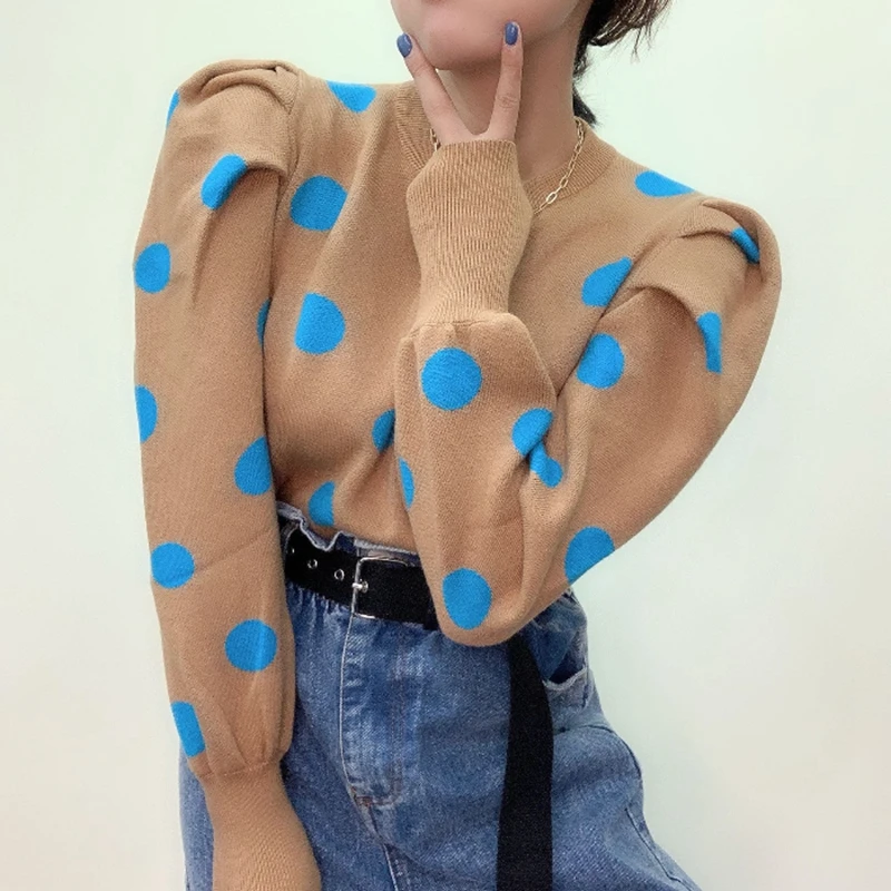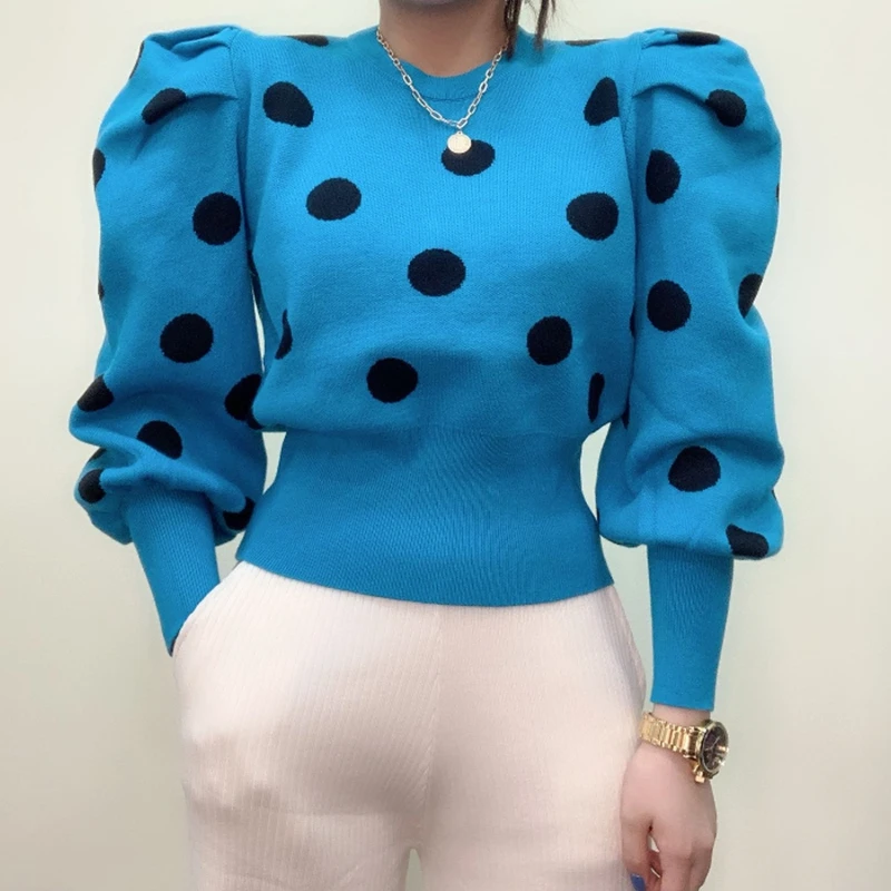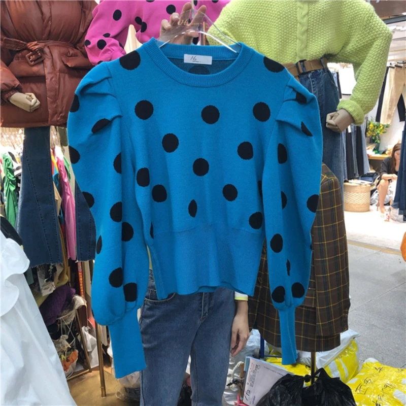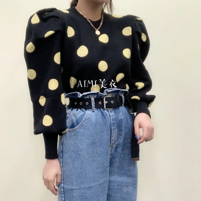 Женский короткий свитер в горошек, модельные пуловеры с пышными рукавами, повседневные короткие свитера в Корейском стиле с круглым вырезом, весна 2019