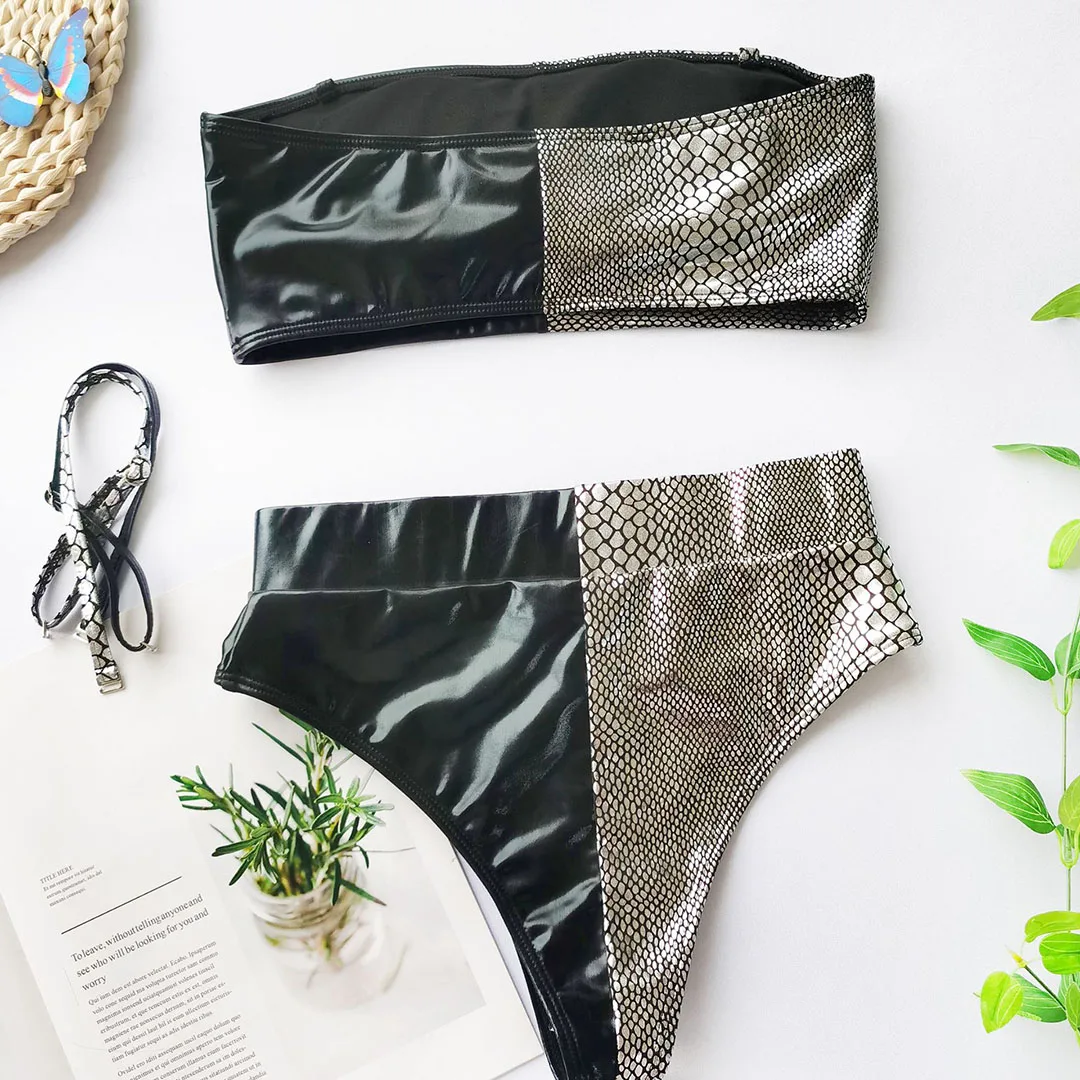 S - XL Блестящий сверкающий женский купальный костюм бикини с высок...