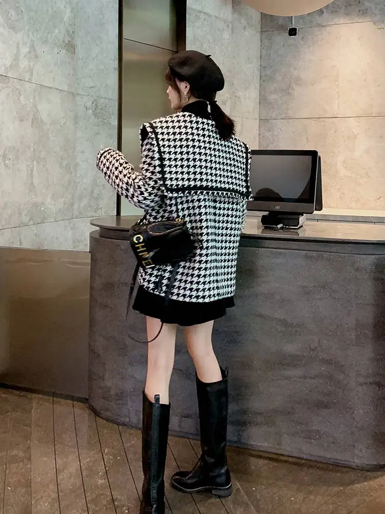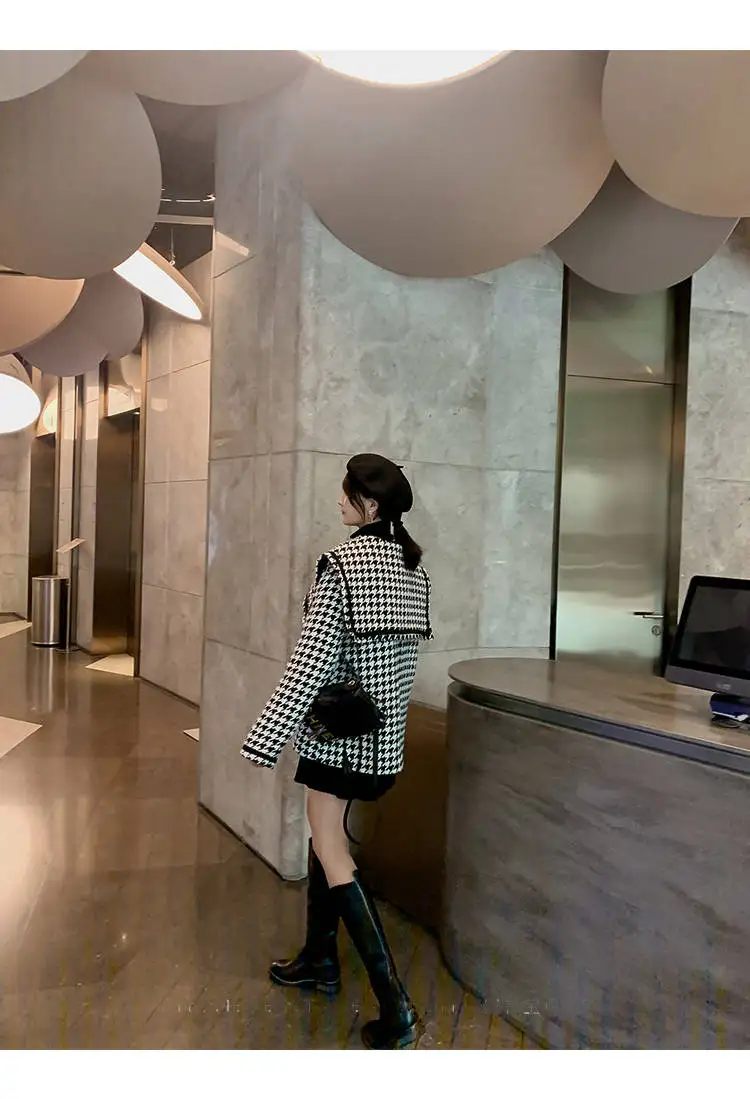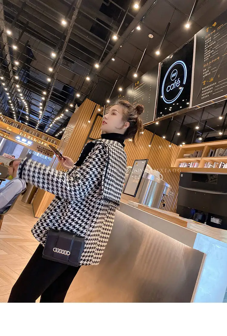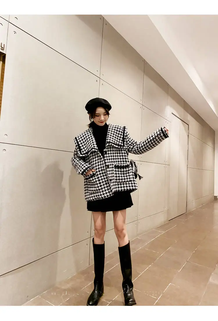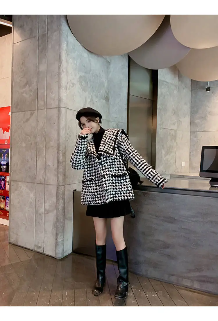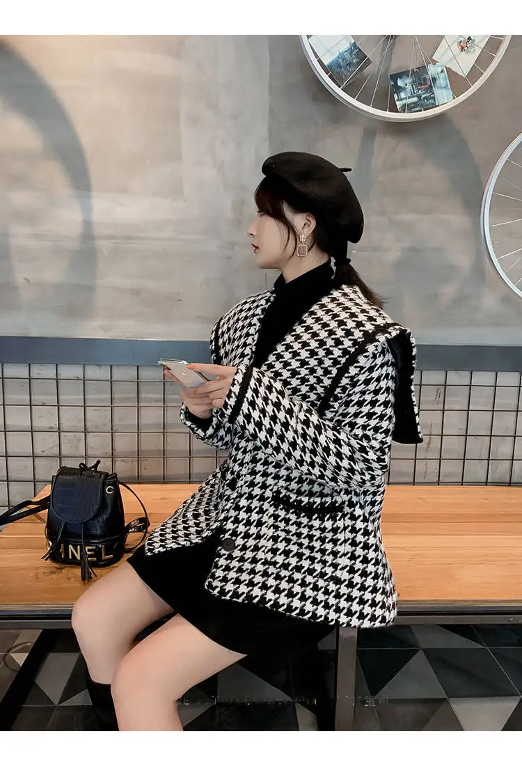 Bella Philosophy 2021 женское клетчатое твидовое короткое пальто Женская Корейская шерстяная куртка с карманами верхняя одежда женское короткое пальто с отложным воротником s