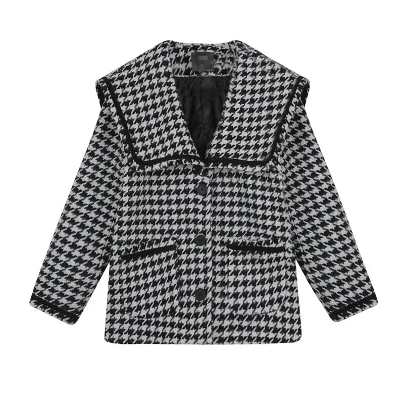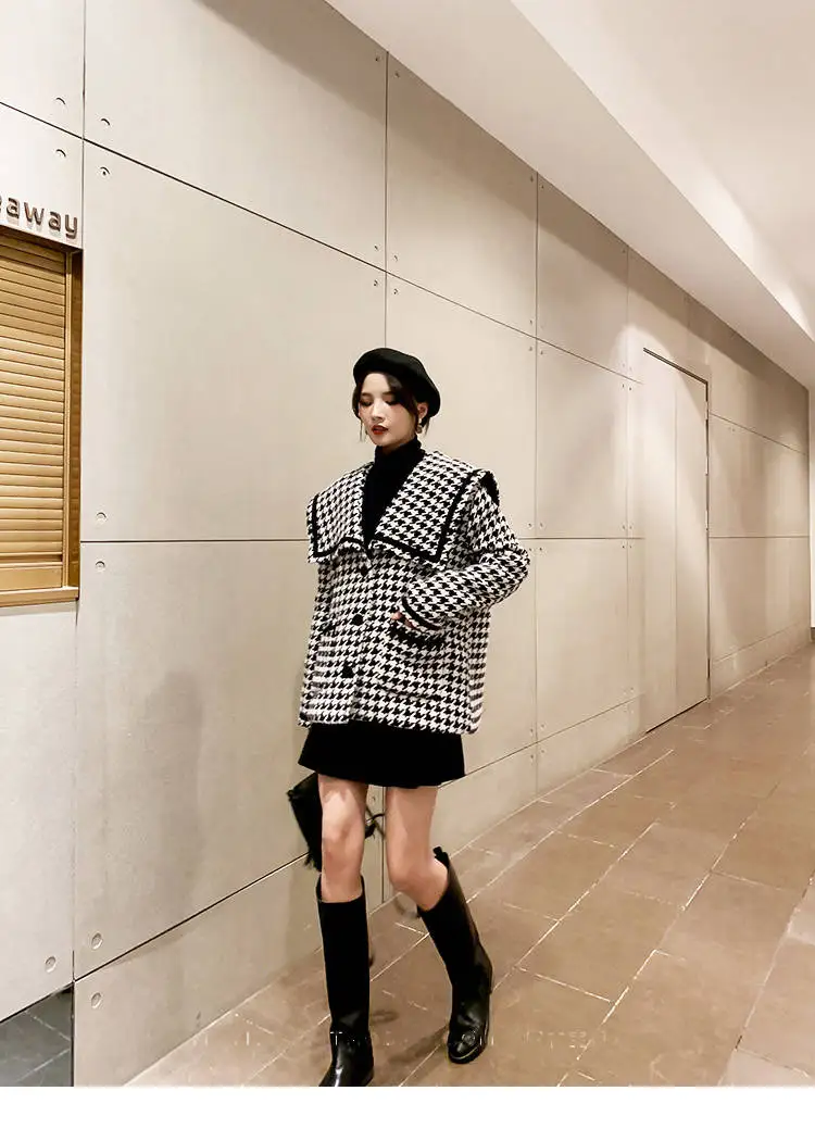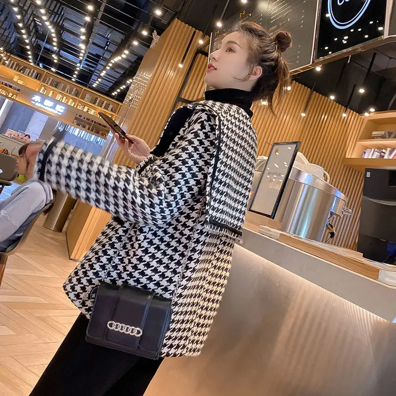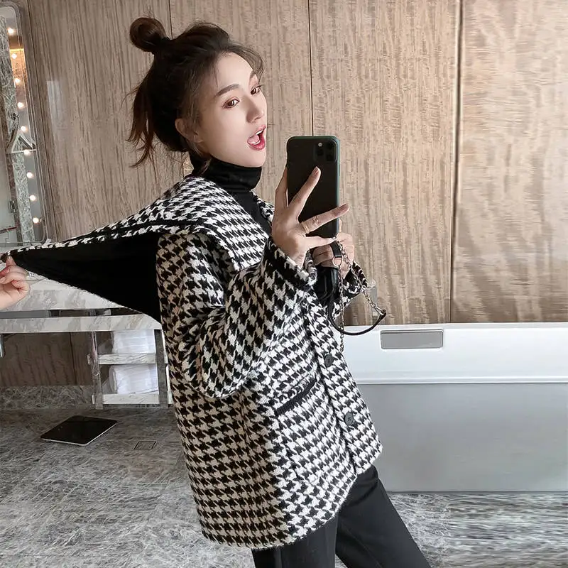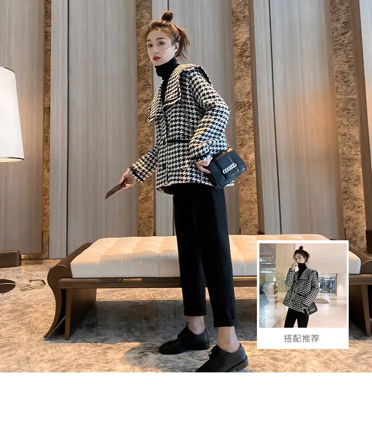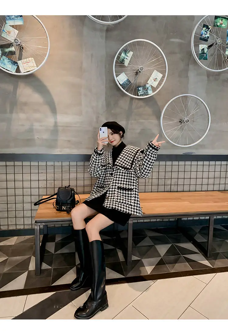 Bella Philosophy 2021 женское клетчатое твидовое короткое пальто Женская Корейская шерстяная куртка с карманами верхняя одежда женское короткое пальто с отложным воротником s