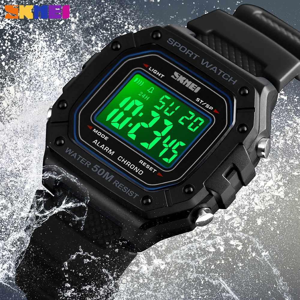 Бренд: SKMEI Часовой механизм: цифровой часовой механизм Пол: мужчин/подростков/студентов Стиль: Модный и повседневный/спортивный Материал корпуса: АБС-пластик Материал ремешка: ремешок из искусственной кожи Пряжка Тип: Пряжка Чехол Форма: прямоугольник Диаметр циферблата: 43 мм Чехол Толщина: 12 мм Ширина ремешка: 19 мм Длина браслета: 260 мм Водонепроницаемый: материал подошвы: полиуретан толщина 5ATM Функция: 50 м водонепроницаемый/Секундомер/время/дата/Будильник/неделя/EL светильник/12/24 часов