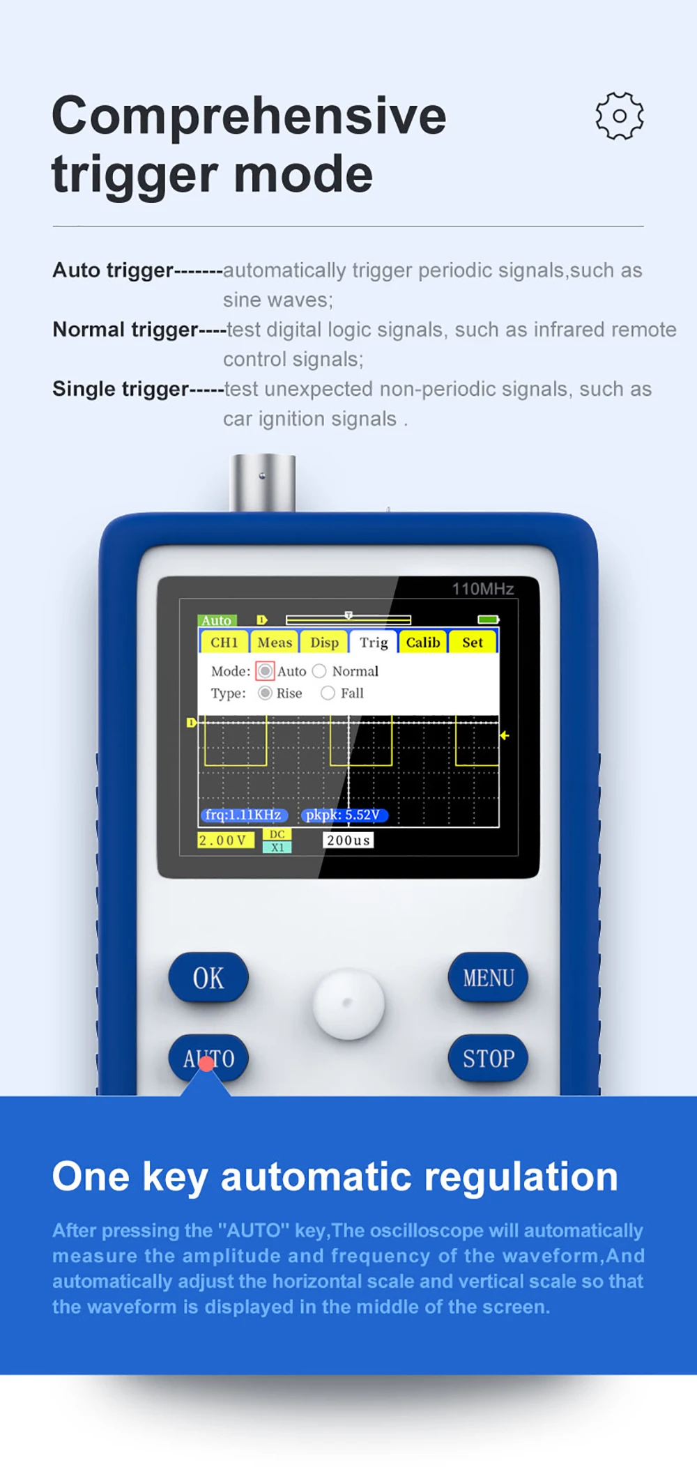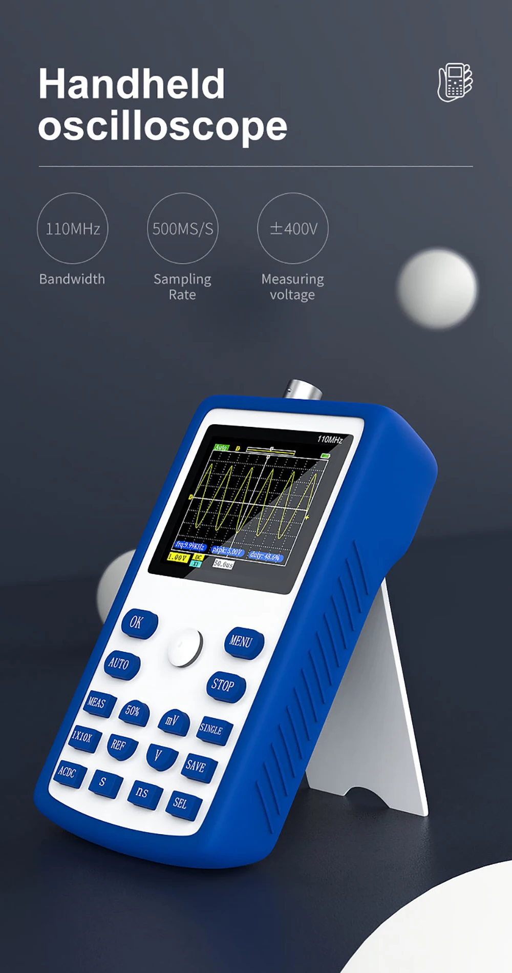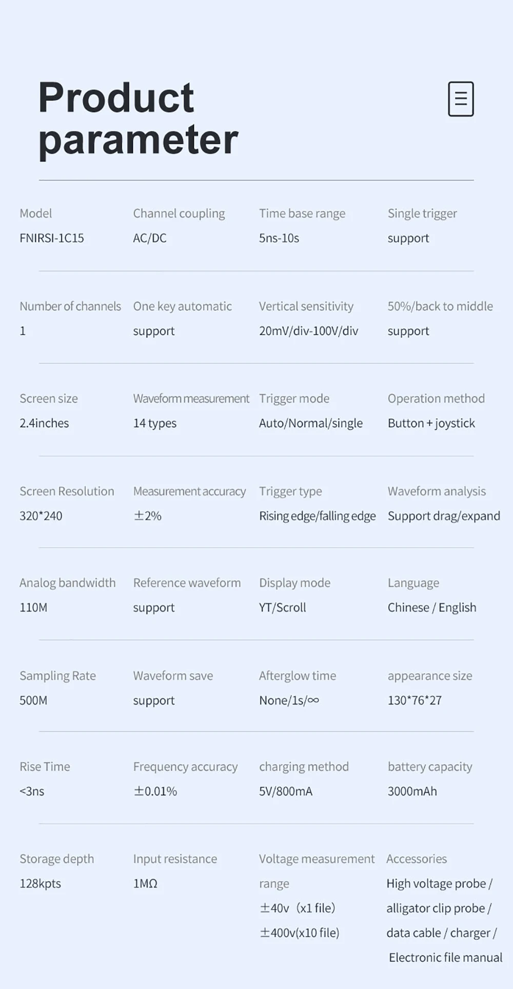 FNIRSI-1C15-это полностью функциональный, практичный и экономичный портативный осциллограф, недавно запущенный FNIRSI. Частота дискретизации в реальном времени составляет 500 м, а аналоговая полоса пропускания-110 МГц. В дополнение ко всем функциям Обычного Ручного осциллографа, мы также добавили на этой основе одну функцию быстрого авто, так что вы можете легко захватывать форму волны, как настольный компьютер. Мы добавили 1k Hz само-тест квадратной волны для FNIRSI-1C15, и глубина хранения была модернизирована до 12kpts. Со ссылкой на форму волны, вы можете сделать паузу в любое время, чтобы сохранить предыдущую форму волны на экране, и вы можете сравнить его с обновленной в настоящее время формой волны. Режимы Afterglow и прокрутки упрощают Обнаружение и запись сигналов. Встроенный аккумулятор емкостью 3000 мАч может работать непрерывно более 10 часов после полной зарядки. Корпус оснащен высококачественной силиконовой втулкой, которая не скользит и не скользит. Джойстик заменяет оригинальные клавиши со стрелками, что делает работу более простой и эффективной.