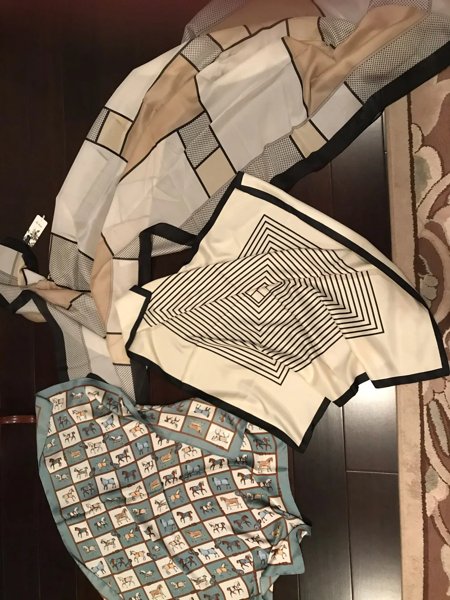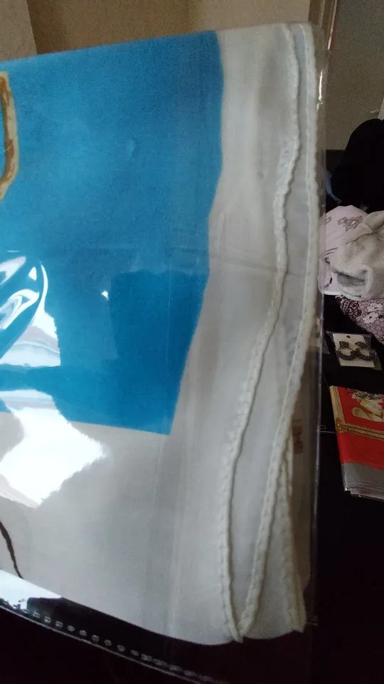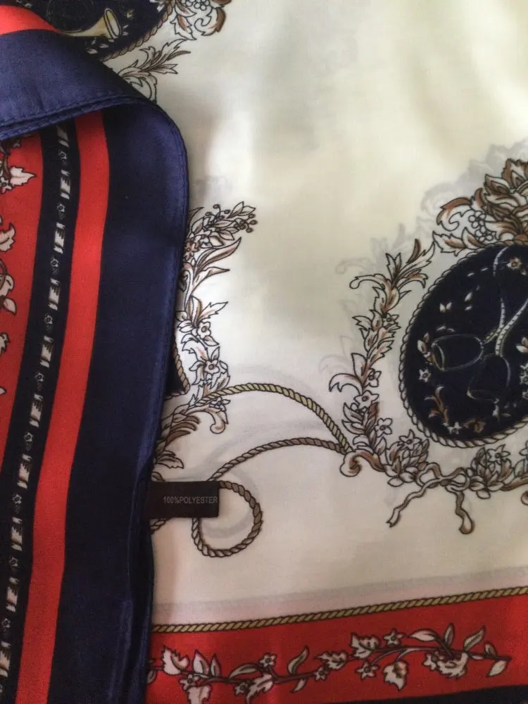 Хороший платочек. Материал тонкий, но приятный на ощупь, шелковистый. Цвет чуть темнее заявленного, скорее серо-зелёный, чем нежно голубой. На моей второй фотографии, где платок сложен, цвет наиболее соответствует реальному .