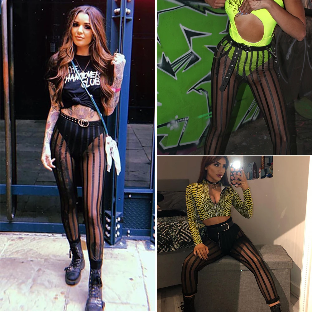 Сексуальные женские сетчатые прозрачные облегающие леггинсы, полосатые Клубные брюки для вечеринок, сетчатые узкие брюки до колена