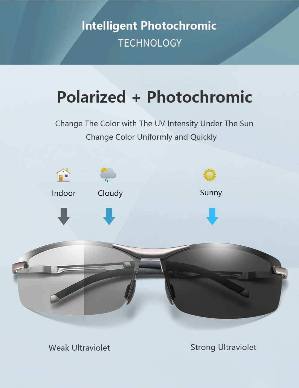 Фотохромные поляризованные линзы:Фотохромные линзы с интеллектуальным коэффициентом светочувствительности.Прозрачные и прозрачные линзы, фотохромные формы.Меняйте с УФ-интенсивностью под солнцем.Вождение в туннеле обычно, не нужно снимать.