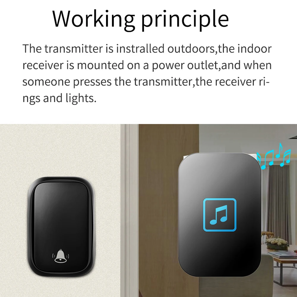 1. Нажмите кнопку, супер обучающий код может свободно научиться сочетать, может быть неограниченным подходящим приемником. 2. Вместо использования батареи, кнопка преобразует кинетическую энергию в электрическую и посылает сигнал при нажатии. 3. Передатчик может нормально работать в снежной или высокой температуре окружающей среды, водонепроницаемый и пыленепроницаемый. 4. Если несколько кнопок соединены с одним или несколькими приемниками в одной системе, каждая кнопка может быть установлена на другой мелодии звонка. 5. Функция отключения памяти: Включите питание снова после выключения питания, не нужно повторно регулировать и блокировать мелодию звонка. 6. Приемник доступен в различных вилках, штепсельных вилках США/ЕС/Великобритании и адаптерах Австралии, подходит для большинства стран. 7. Привлекательная подсветка мигает, когда кто-то толкает дверной звонок. Особенно подходит для пожилых, глухих и беременных женщин. 8. Напряжение приемника составляет 220 В. 9. Приёмник находится на расстоянии 150 метров (в открытой местности), что может зависеть от окружающей среды и препятствий. 10. Приемник имеет 60 мелодий звонка на выбор, а громкость 0-110 дБ на 5 уровнях. 11. Просто подключите приемник к электрической розетке, кнопочный передатчик может быть приклеен к двери с помощью клейких лент. 12. Размер передатчика: 70*46*24 мм, Размер приемника: 92*62*32 мм Примечание: Кнопка не может быть размещена на железной двери, потому что это будет мешать сигналу. Если приемник не звонит при нажатии кнопки после получения дверного звонка, Пожалуйста, подключите дверной звонок.