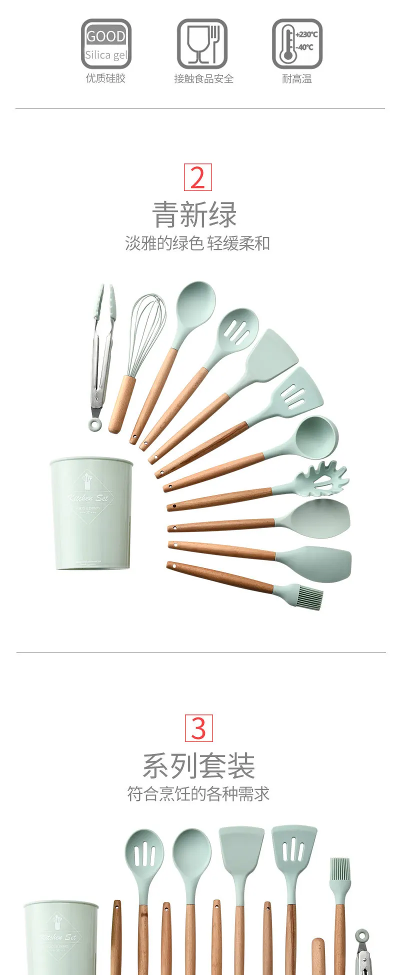 Зеленая силиконовая посуда, набор инструментов с деревянной многофу...