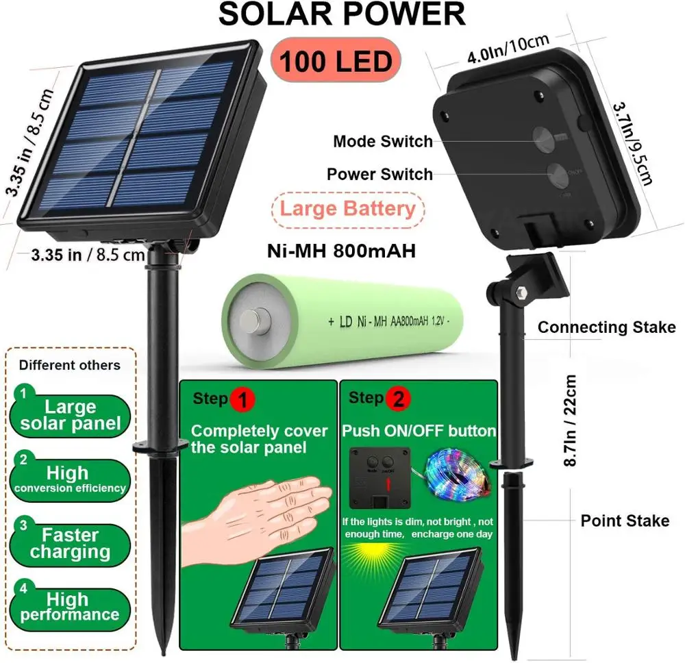 Модернизированная большая солнечная панель занята поиском источников питания, чтобы светильник был на открытом воздухе? Тщательно Защитите ваши розетки и фонари от воды? Если это именно то, где вы находитесь, солнечные канатные огни могут вывести вас из этих ситуаций! Экономьте деньги, экономьте энергию на солнечных батареях и экономьте затраты-Включите автоматически в сумерках, если полностью заряжено в течение дня, освободив вас от счета за электричество или проблем с поиском торговых точек. Водонепроницаемый панель солнечных батарей светильник s для приготовления пищи на воздухе светильник ing в садах, выбирать модель на размер больше, вместо того, чтобы сделать и т. Д. Декоративные Применение Великий украшение принести творческую светильник шоу. Он может быть украшен в саду, патио, вечерние, Рождественская елка, свадьба, спальня, двор, коридор, праздник, фестиваль, Пасха, лестницы, бары, балконы и т. Д. Вероятно, самый декоративный товар, который вы достойны получить. 8 светильник ing Modes веревка Светильник обеспечивает 8 светильник ing Режимы (сочетание, в волне, последовательный, Slo glo, чеканка/вспышка, медленное выцветание, мерцание/вспышка, устойчивый), которые могут удовлетворить различные требования. Обратите внимание на окружающую среду использования 1. Время работы: солнечные канатные огни будут освещаться в течение более 10 часов с полной зарядкой (требуется непрерывная зарядка в течение 6-8 часов). Время работы зависит от интенсивности солнечного света, местоположения, погодных условий и сезонных сдвигов. 2. Яркость: канатные огни достаточно яркие для акцентного освещения (не привлекают Жуков), но не для сфокусированного освещения. 3. Длина: фиксируется светильник. Его нельзя разрезать или продлевать.