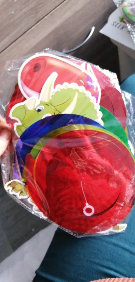 На фото в магазине другие картинки на тарелках. Тема - тоже динозавры, но пришли тарелки (большие и малые) с одинаковыми рисунками, хотя на сайте разные