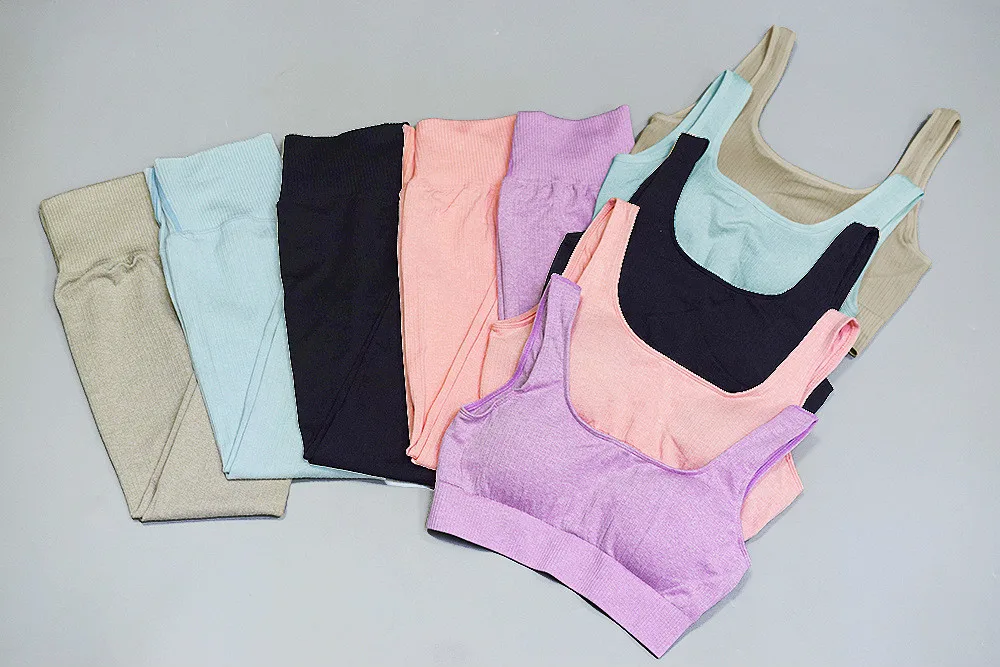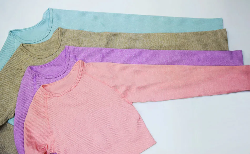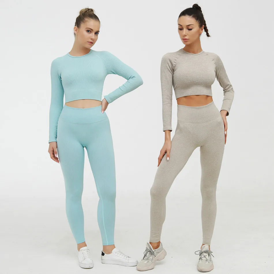 Бесшовный костюм для йоги, спортивный комплект, одежда для тренажерного зала, женский укороченный Топ с длинным рукавом, леггинсы с высокой талией, комплект для тренировок в рубчик, спортивные костюмы