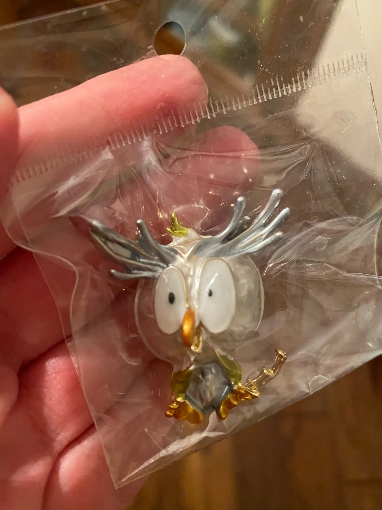 Посылочка шла ровно месяц до Свердловской области. Продавец большой молодец. Объеденил два заказа в один. Изумительно милые брошки совята.Качество отличное следов сколов или непрокраса нет . Застёжка удобная. Отличный подарок на любой праздник