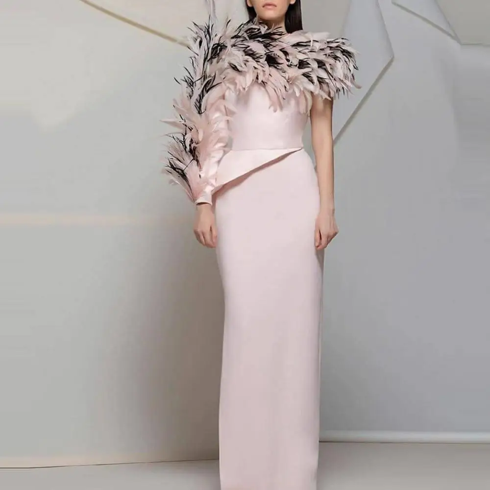 Женские вечерние платья с перьями, розовые прямые длинные наряды в пол с одним открытым плечом и длинным рукавом для торжественных мероприятий