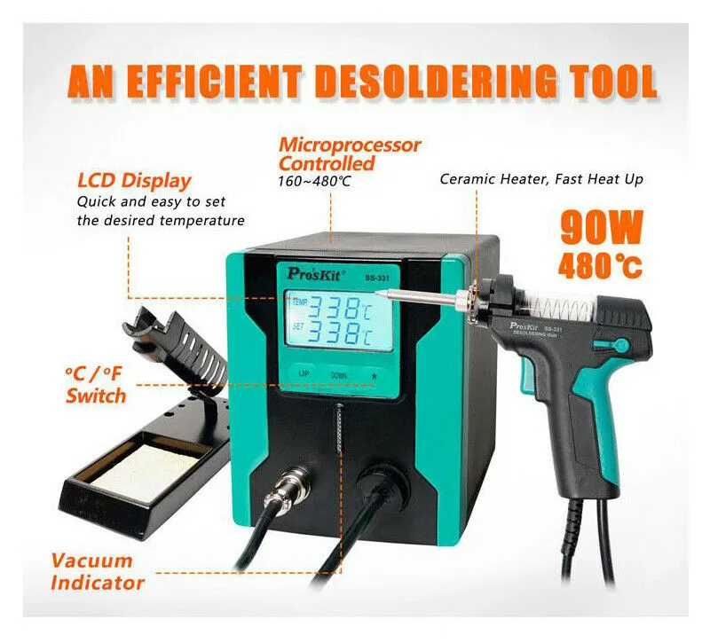 SS-331 разработан специально для распайки без свинца. Быстрый нагрев и высокая мощность обеспечивают удобную и четкую пайку/распайку всех типов компонентов DIP. Разумная структура, управление одной рукой и высокая поглощающая способность могут быть легко удалены остатки припоя с односторонней или двусторонней печатной платы. Светодиод управления микропроцессором обеспечивает точный контроль температуры от 160 до 480 °C.