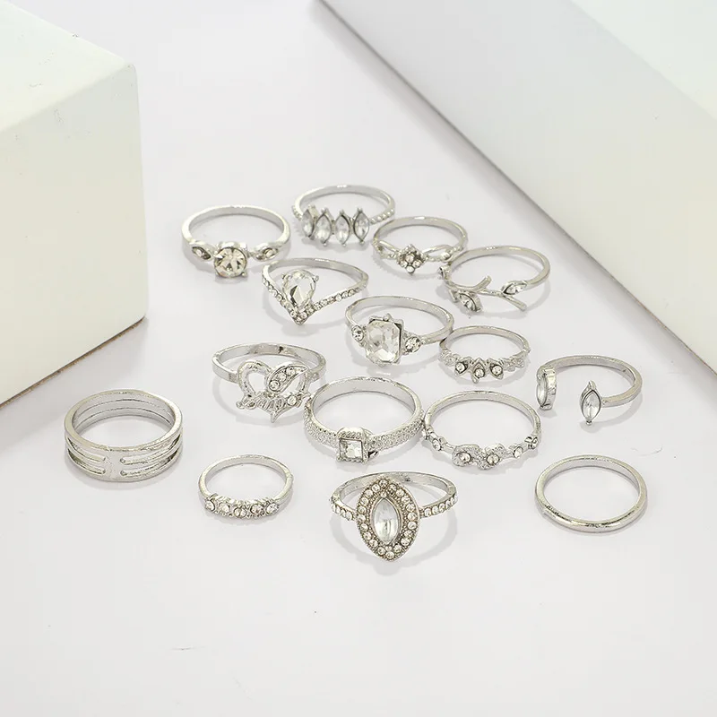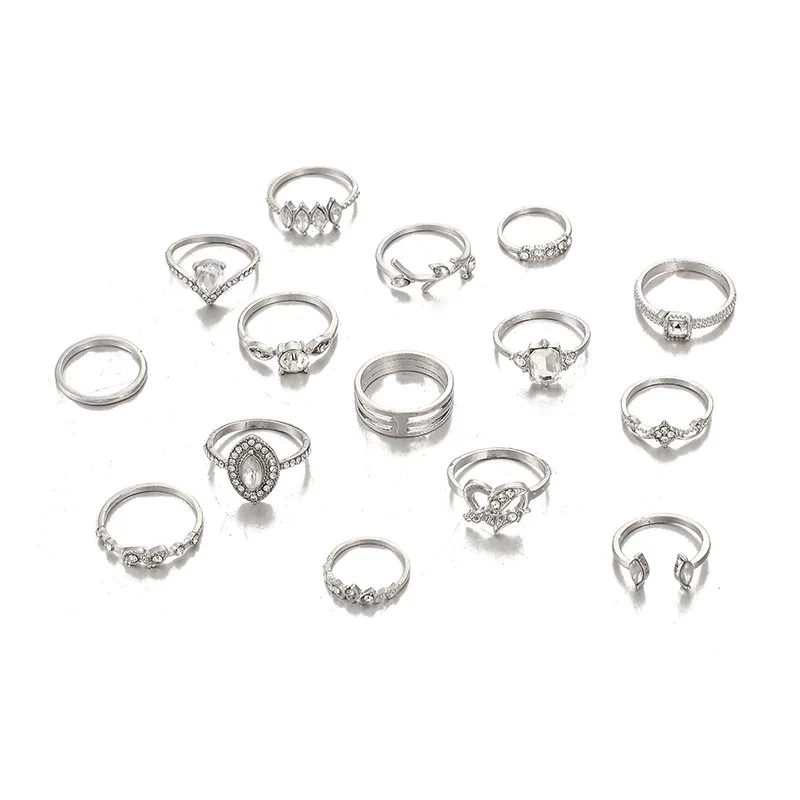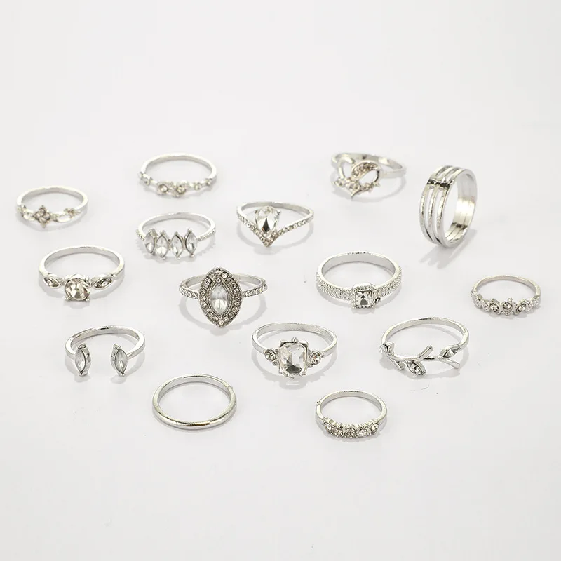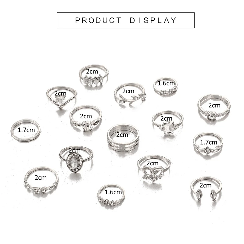 15 шт.компл. женское богемное винтажное геометрическое кольцо Стразы с короной, цветком, сердцем, листьями, кристаллами, набор колец для свадебной вечеринки, подарки