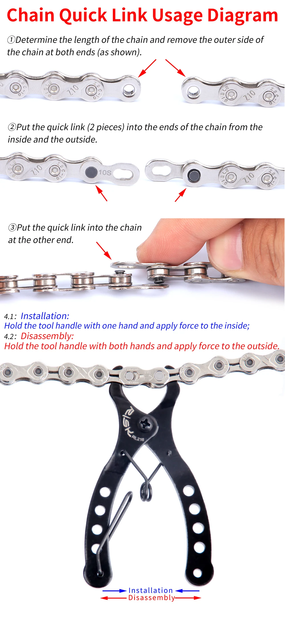 Характеристики: Материал: Высокоуглеродистая сталь Вес: около 50 г В комплект входит: 1 x велосипедный мини-инструмент для быстрого соединения цепи