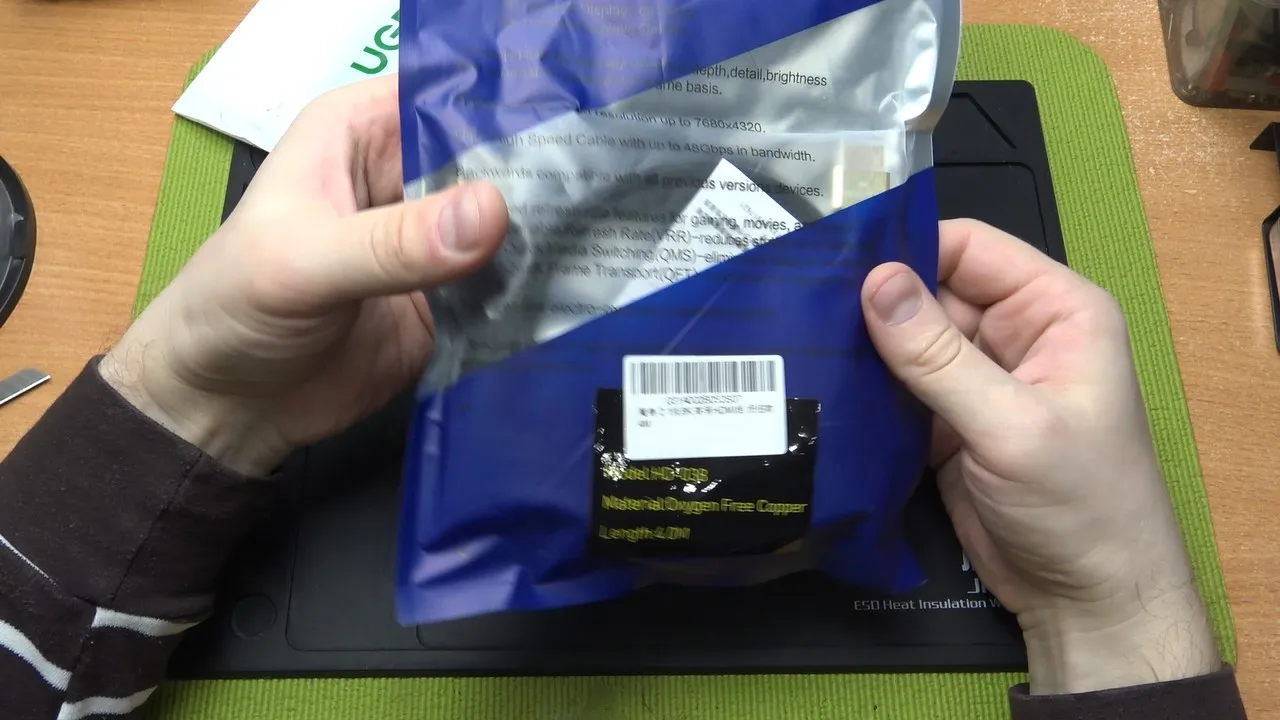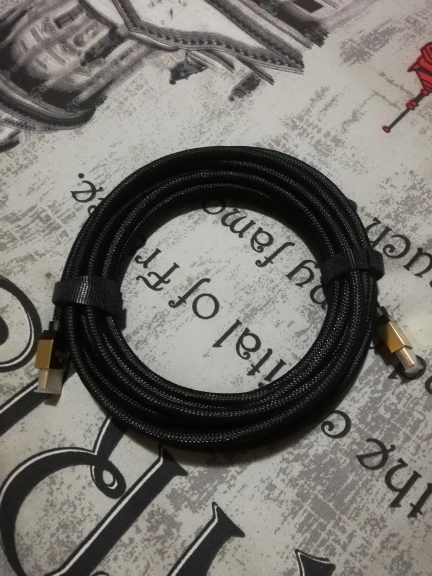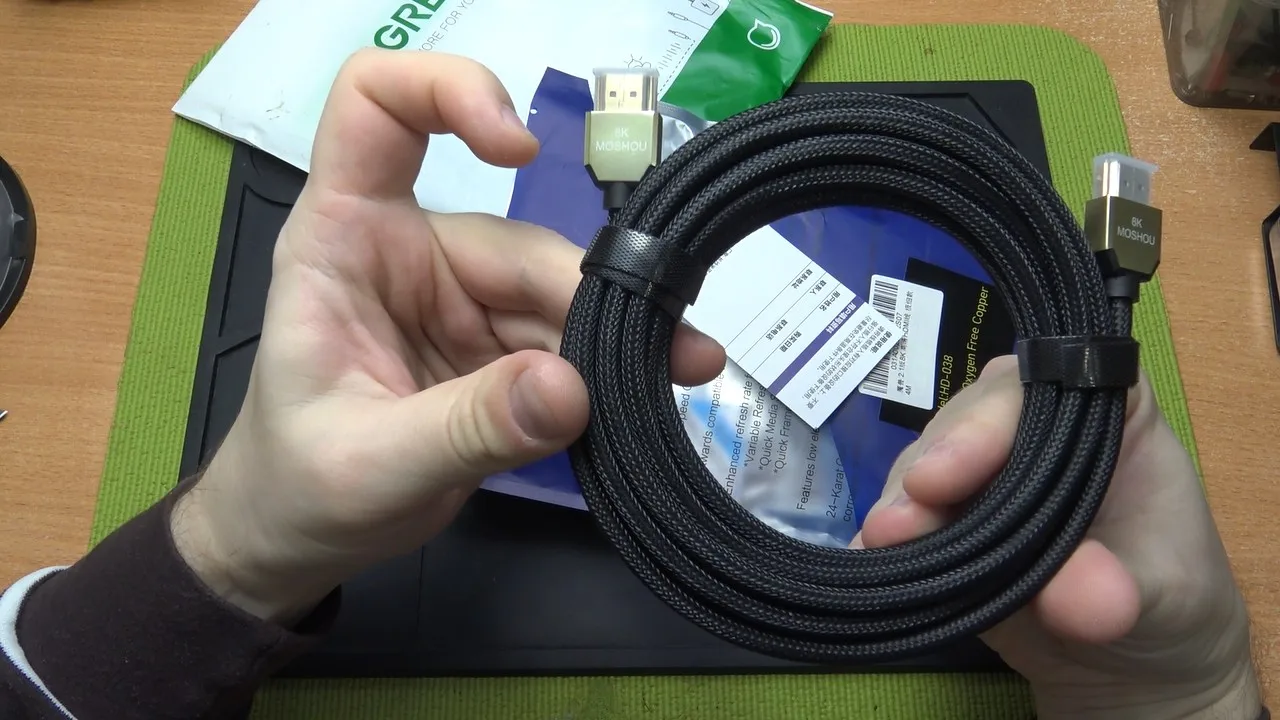 Кабель имеет весьма тонкий провод и небольшой вес, но в то же время имеет плотную оплётку, что позволяет надеяться на хорошую защиту от перегибов, изломов и т.п. 5-метровый кабель, который я заказал, выполнил ту задачу, которую я на него возлагал: подключение компьютера к 4k телевизору. К сожалению, у моего телевизора частота дискретизации всего 60 Гц, поэтому я не смог проверить, будет ли работать кабель при 120 Гц. Но HDR работает исправно.