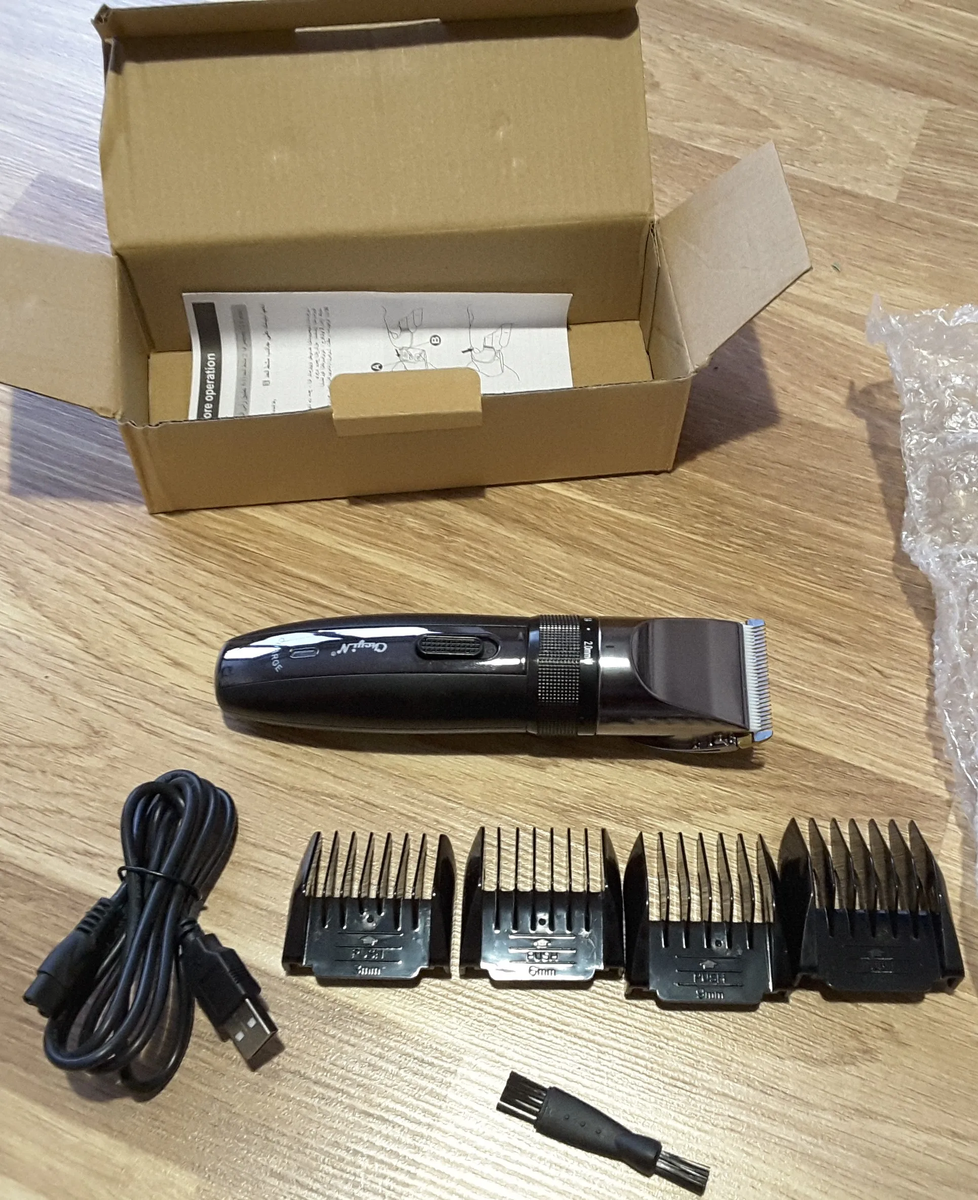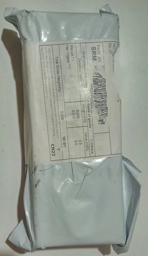 Доставка до двери менее чем за десять дней (в город Пенза). Упаковка - простая картонная коробка и пупырка. Комплектация "в духе времени" - нищая. Нет ни сумки для хранения, ни подставки, зарядника тоже нет. Зато есть инструкция на английском и, видимо, арабском. За эту цену сойдет. Минимальная длина 0,8мм (указано на корпусе), максимальная (без насадки) 2мм. Не подходит для влажной стрижки (указано в инструкции). Верхние лезвия подозрительно напоминают пластик, нижние сталь.