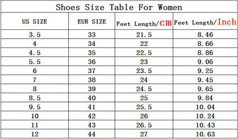 Добро пожаловать в наш магазинНаслаждайтесь покупкамиПримечание для обувиРазличные фабрики и различные партии продукции имеют разные американские размерыМы отправляем обувь европейского размераКак выбрать размер?Это не стандартный американский размерПожалуйста, выберите размер в соответствии с вашим Европейским размером, длиной стопы или длиной обуви внутри.Мы отправляем товар в соответствии с европейскими размерами или длиной стопы.Например:Если вы выбираете нас 4,5, мы вышлем евро 35.It поставляется с 22,5 см длина стельки.Пожалуйста, примите во внимание возможную 0,5-1 дюйм) в связи с тем, что замеры выполняются вручную, могут измерения (1 дюйм = 2,54 см)