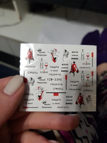 Прикольные стикеры на ногти) доставка больше 30 дней. На ногти клеются трудновато, нужно намочить стикеры и предельно аккуратно нанести на ногти. Плохо, что их неудобно разглаживать на ногте, комкаются. 2 наклеила 3 запорола.