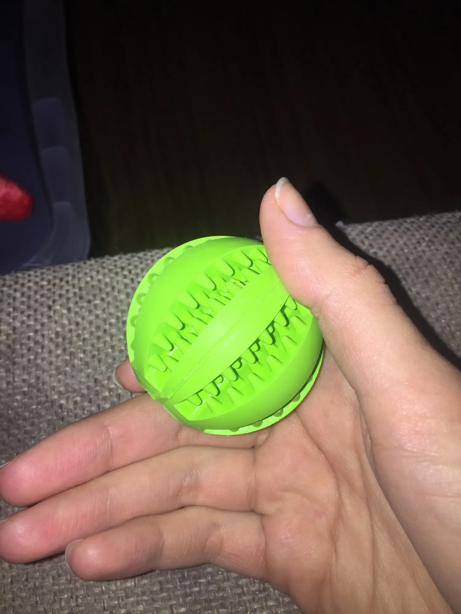 отличный мячик, для средней собаки (у нас шелти) как раз по размеру, и прыгучий, без запаха, пришел быстро, даже упакован в пупырку, вкусняшки удобно засовывать. если хорошо запрятать, собака долго занимается, и потом спит с ним, наверно воспоминания приятные