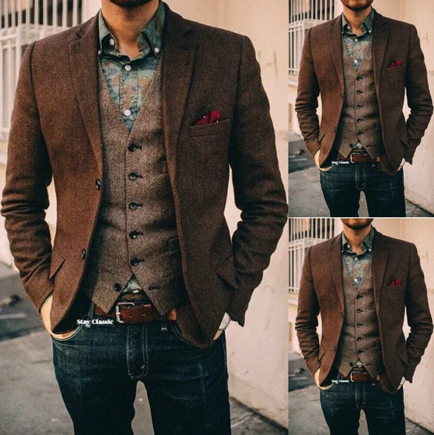 Мужской винтажный костюм-двойка, коричневый пиджак с жилетом в елочку, на двух пуговицах, s-образный, 2020