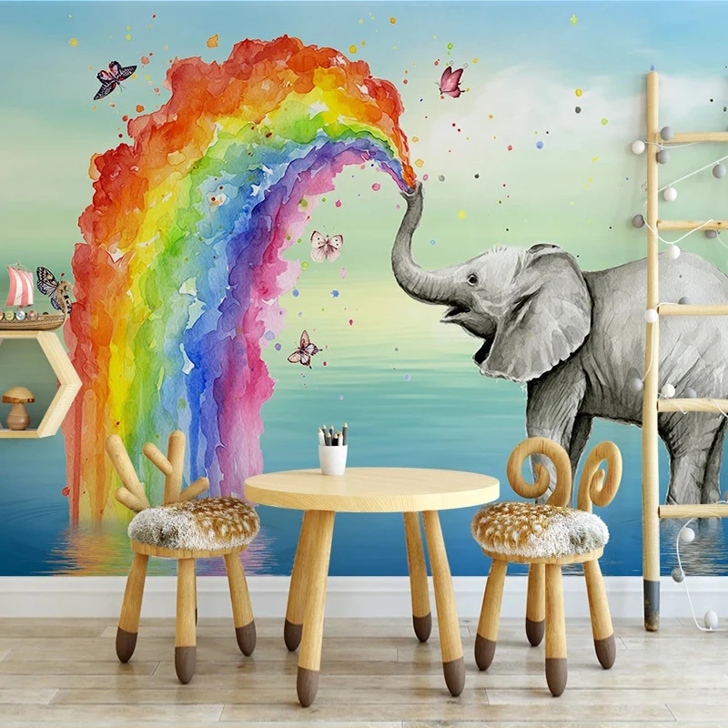Фотообои на заказ с животными, Раскрашенные вручную, мультяшный Радужный слон, настенная живопись, детская комната, детский сад, украшение для спальни