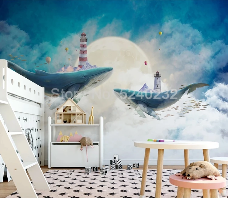 Пользовательские фотообои в скандинавском стиле креативные ручная роспись небесно-голубые белые облака мультфильм КИТ Детская комната фон искусства